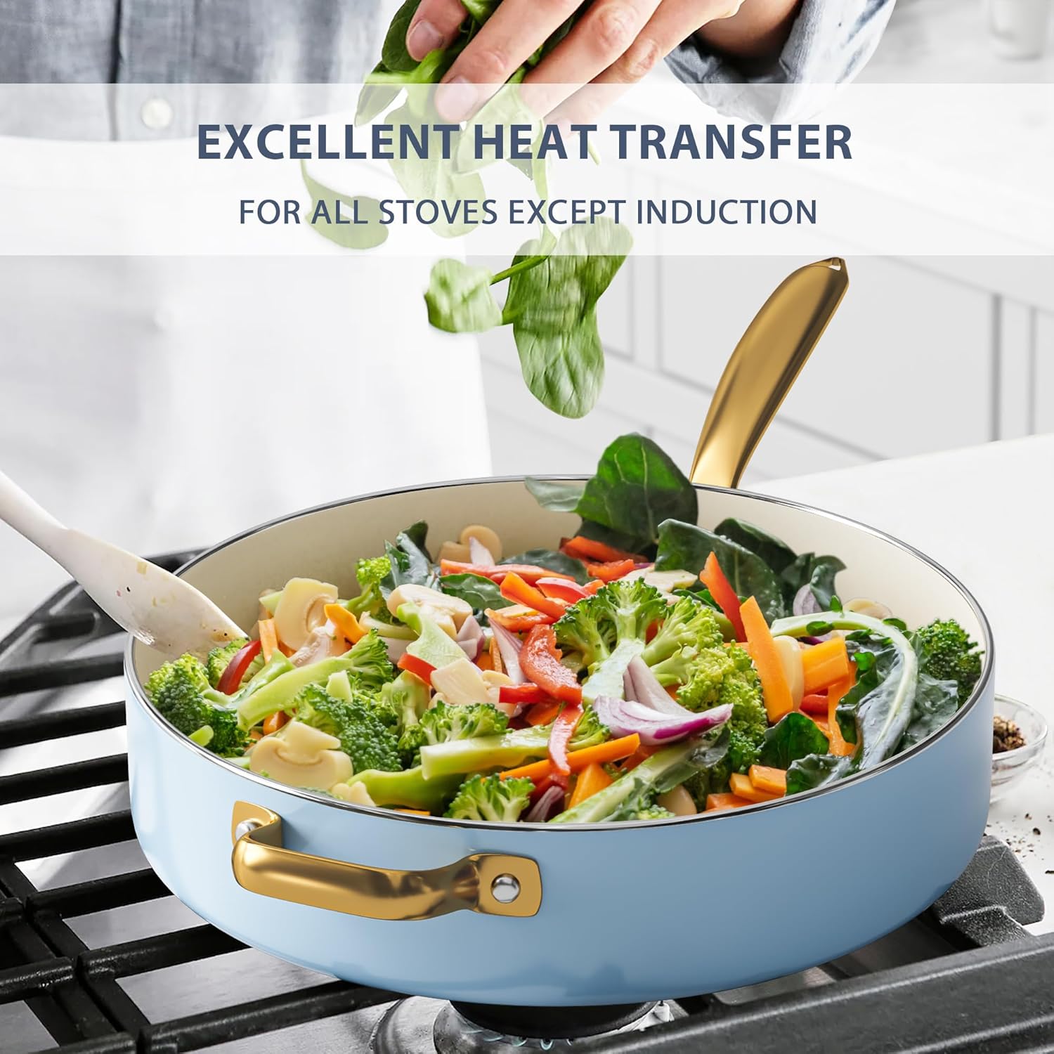 - 【Non Toxic Ceramic Coating】- Ceramic pots and pans set nonstick are free of PTFE, PFOA, PFAS, lead, cadmium and other toxic materials, 100% safe for you, your family, and the environment
