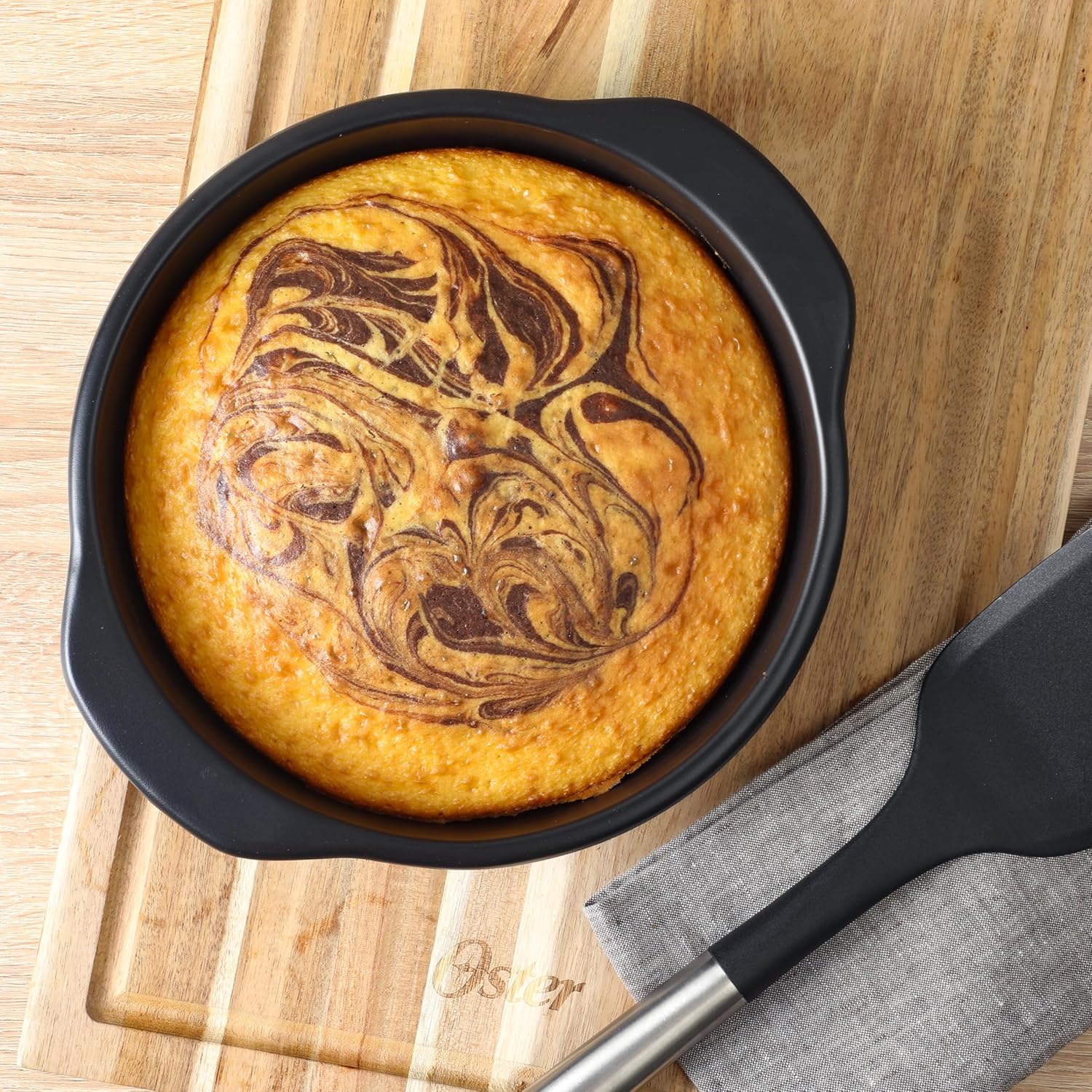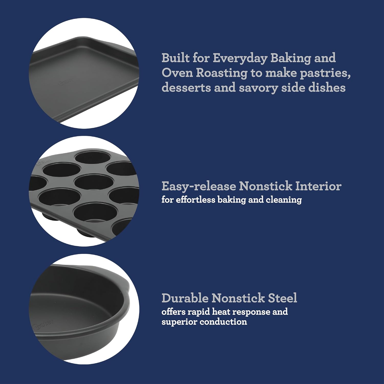 - A BOX CONTAINS: Two 9-inch round cake pans, one 9-inch loaf pan, one 13-inch cookie sheet and one 12-cup muffin pan from the Oster Platinum Collection