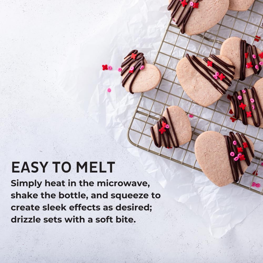 - EASY TO MELT: Simply heat in the microwave, cool slightly, shake bottle and squeeze to create sleek effects as desired; drizzle sets with a soft bite; this 5 oz bottle will coat the top or drip the sides of one 8” cake