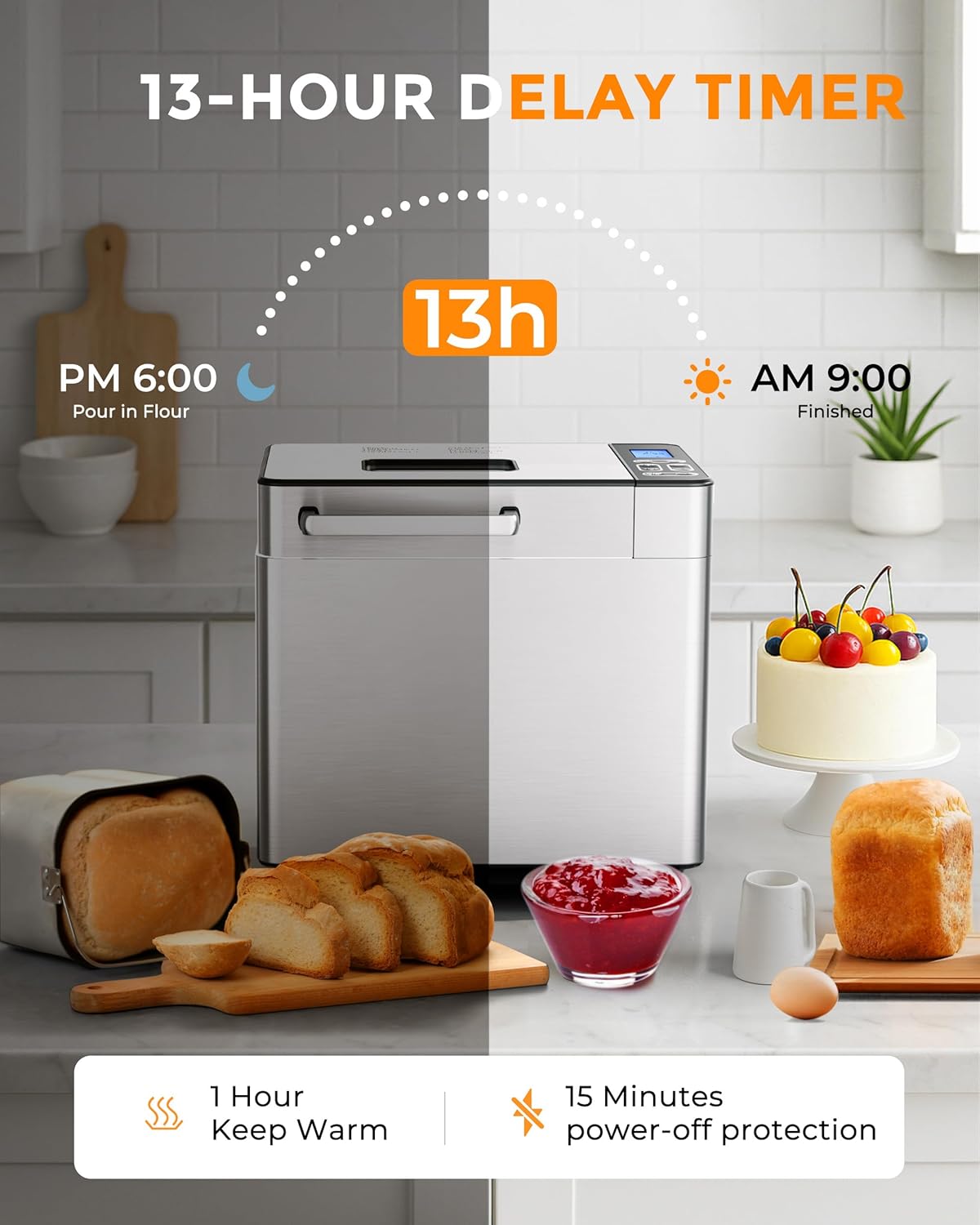 - 𝟏𝟑 𝐇𝐨𝐮𝐫𝐬 𝐓𝐢𝐦𝐞𝐫 & 𝐊𝐞𝐞𝐩 𝐖𝐚𝐫𝐦 𝐌𝐨𝐝𝐞: Our smart bread maker is equipped with a 13-hour delay timer, a 1-hour keep warm system, and a 15-minute power outage memory function, with our bread making machine, you can enjoy freshly baked bread anytime, whether it's in the early morning or after work. And the digital control panel of the Euhomy small bread maker makes the operation easier and more precise