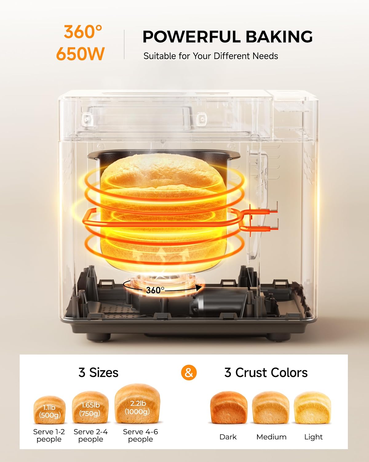 - 𝐋𝐚𝐫𝐠𝐞 𝟐 𝐋𝐁 𝐂𝐚𝐩𝐚𝐜𝐢𝐭𝐲: With our 2 LB capacity, this bread maker machine allows you to bake and enjoy larger bread, making it very suitable for family sharing. It also offers 3 crust shades (light, medium, dark) and 3 loaf sizes (2lb, 1.5lb, 1lb), enhancing your bread-making experience. Our viewing window allows you to enjoy the show of making bread. And the thoughtful design of insulated handle makes it safe for you to open the lid, and 𝐲𝐨𝐮 𝐣𝐮𝐬𝐭 𝐧𝐞𝐞𝐝 𝐭𝐨 𝐭𝐮𝐫𝐧 𝐚𝐧𝐝 𝐥𝐢𝐟𝐭 𝐭𝐡𝐞 𝐩𝐚𝐧 𝐭𝐨 𝐫𝐞𝐦𝐨𝐯𝐞 𝐢𝐭