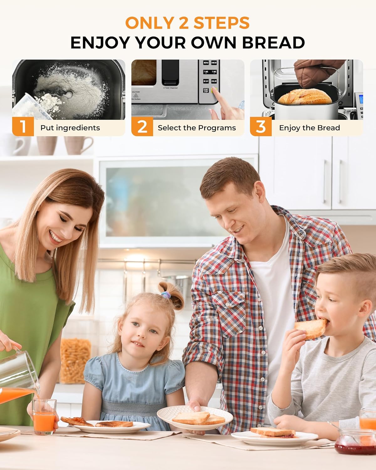 - 𝐁𝐫𝐞𝐚𝐝 𝐦𝐚𝐤𝐞𝐫 𝐟𝐨𝐫 𝐁𝐞𝐠𝐢𝐧𝐧𝐞𝐫: Enjoy effortless cooking with our 25 in 1 bread maker machine. Find the program number you want to use on the machine's upper cover, while our recipe book brings you inspiration, letting you customize your own bread creation. Simply add the ingredients, select a program, and let the bread maker do the rest: from kneading to baking. 𝐘𝐨𝐮 𝐜𝐚𝐧 𝐚𝐥𝐬𝐨 𝐩𝐫𝐞𝐬𝐬 𝐒𝐓𝐎𝐏 𝐭𝐨 𝐩𝐚𝐮𝐬𝐞 𝐚𝐧𝐲𝐭𝐢𝐦𝐞, 𝐨𝐫 𝐡𝐨𝐥𝐝 𝐒𝐓𝐎𝐏 𝐟𝐨𝐫 𝟐 𝐬𝐞𝐜𝐨𝐧𝐝𝐬 𝐭𝐨 𝐜𝐚𝐧𝐜𝐞𝐥 𝐭𝐡𝐞 𝐩𝐫𝐨𝐠𝐫𝐚𝐦