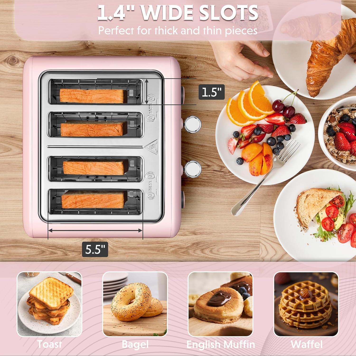 - EXTRA WIDE SLOTS - 4 wide (1.4'') slots with self-centering guides, perfect for different kinds of slices. And its compact design can save space on your countertop.