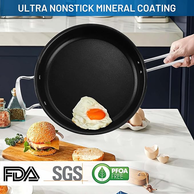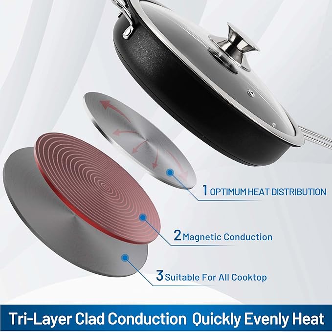 - Built to Last - Our pots and pans boast a 3-ply premium stainless steel base with a thick aluminum core for even heat distribution and outstanding durability. Non-toxic and resistant to discoloration, this cookware won't react with food or affect flavors, ensuring safe and healthy meals. Experience faster cooking with reduced hot spots that can burn food, saving both time and energy!