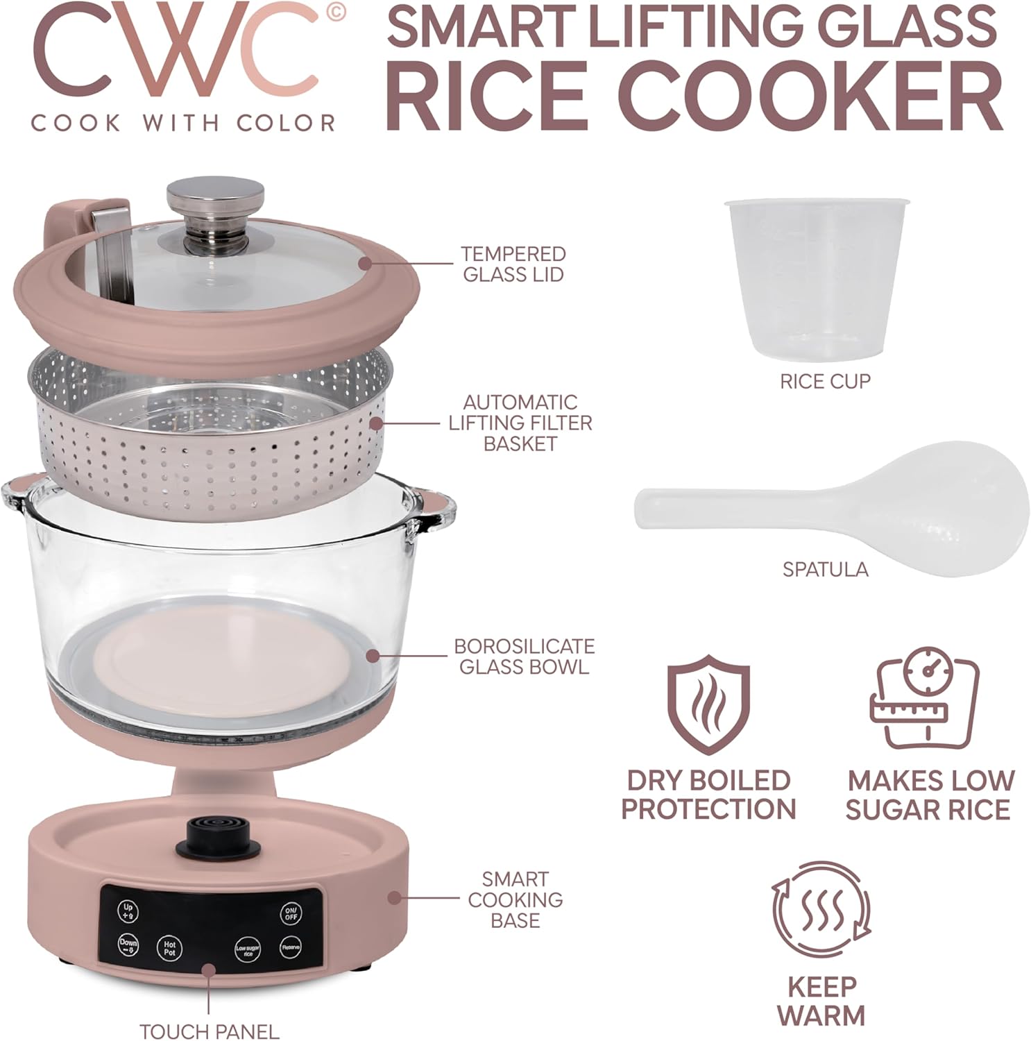 COOK WITH COLOR 3L Glass Low Carb Rice Cooker - Makes 6 Cups Low Sugar Rice with Auto Lift Filter Basket, Hotpot & Steamer for Rice, Grains and Oats, Digital Panel with Keep Warm Function, Blush