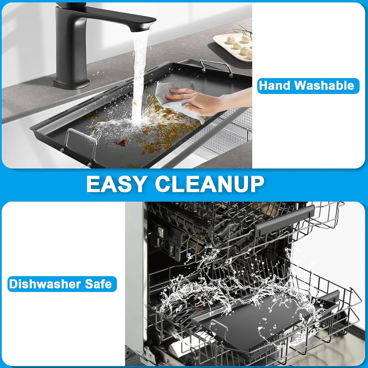 - Practical Flat Top Griddle: The full-size griddle is made from high-quality, durable metal with a non-stick coating that's easy to clean and can withstand high temperatures, ensuring even cooking without burning. Plus, with removable handles and heat-resistant gloves for safe and comfortable use, and a built-in grease trap to keep your cooking area clean, your cooking experience is as enjoyable as it is mess-free