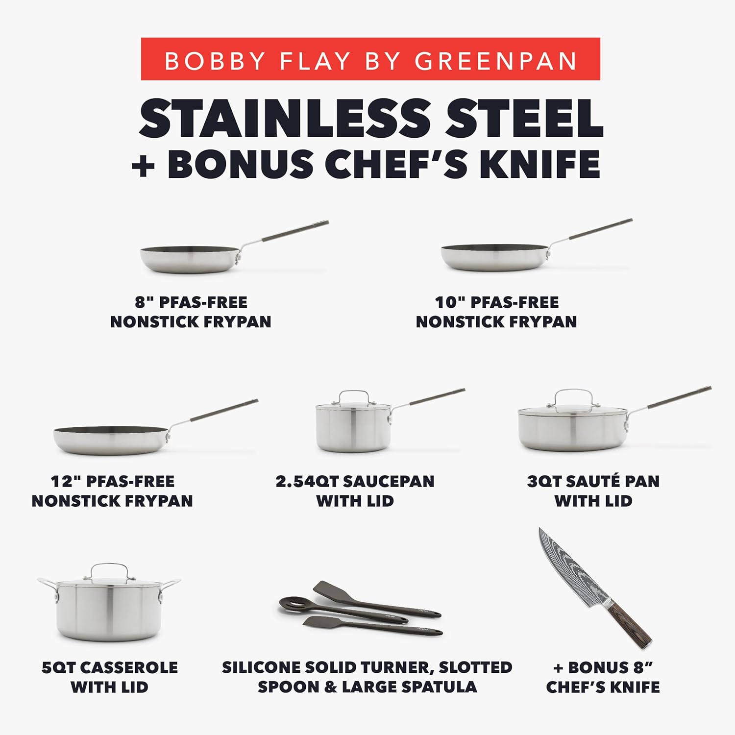 GreenPan x Bobby Flay Stainless Steel 12 Piece Cookware Pots and Pans Set and 8" Chef's Knife, Professional Grade Tri Ply, PFAS-Free Ceramic Nonstick, Induction Suitable, Dishwasher & Oven Safe