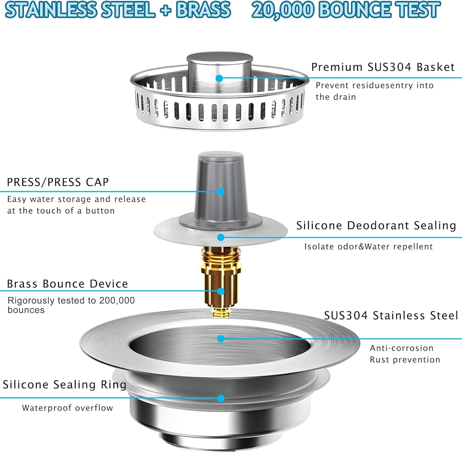 - EFFICIENT ANTI-CLOGGING DESIGN FOR KITCHEN USE: Featuring an upgraded bounce core and fine mesh strainer, this stopper provides superior anti-clogging performance. It’s perfect for filtering food waste, preventing blockages, and ensuring smooth drainage in kitchen sinks