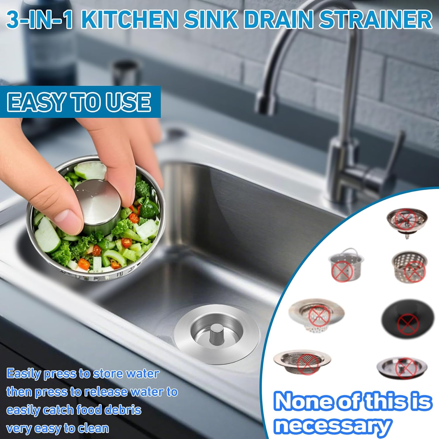 - UPGRADED 3-IN-1 STAINLESS STEEL SINK STOPPER: Crafted from premium SUS304 stainless steel with a rust-resistant brushed finish, this multifunctional sink accessory integrates a stopper, strainer, and odor blocker. Ideal for kitchen sinks, it effectively catches food scraps, debris, and small particles, while preventing clogs and odors. Its durable design supports easy waste collection and cleaning, ensuring a cleaner and more efficient kitchen experience