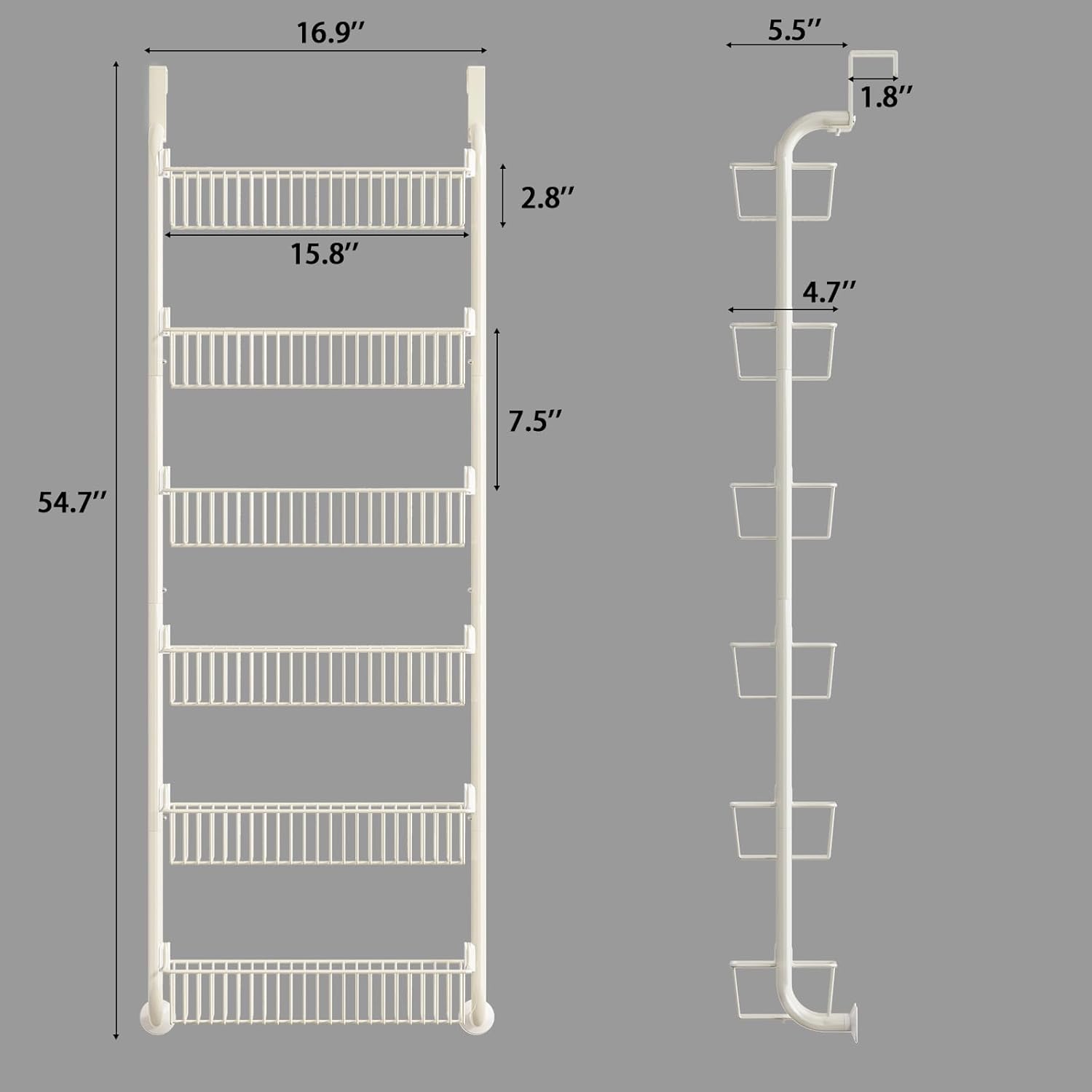 - 【LARGE CAPACITY】Overall Dimensions: 16.9"W x 5.5"D x 54.7"H. Each basket size: 15.8"W x 4.7"D x 2.8"H. It can place a large number of seasoning jars, snacks, snacks, etc, making the space more tidy. (Please measure the door frame size before purchasing, door thickness<1.8", door gap >0.08")