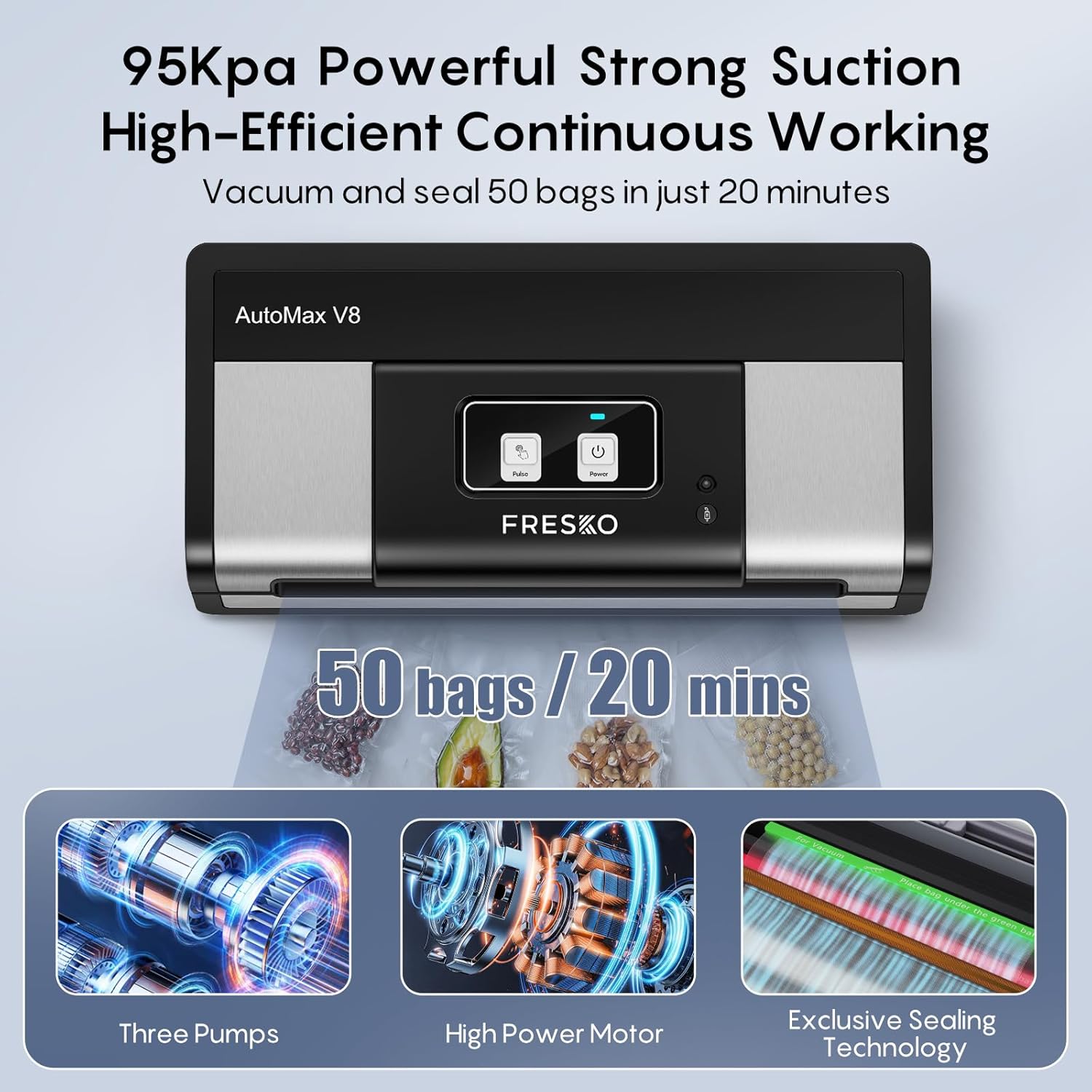 - 【Superior Performance/Low Noise】With powerful suction and exclusive sealing technology, our vacuum sealer effectively seals up to 50 bags continuously within 20 minutes. It is compatible with all brands of vacuum sealer bags. The 2025 newly upgraded noise-control technology makes vacuum sealer run quietly