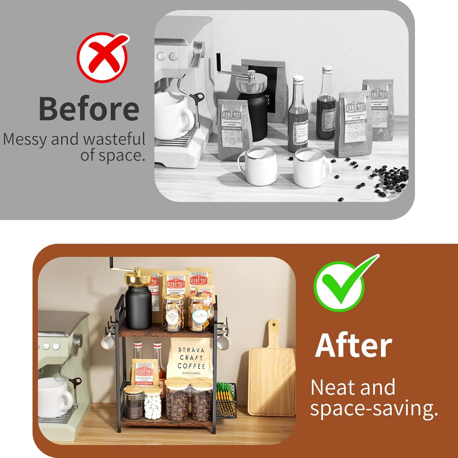 - Convenient Organization: This 2-tier wooden counter shelf neatly organizes your coffee bar essentials like mugs, cups, syrups, and creamers.