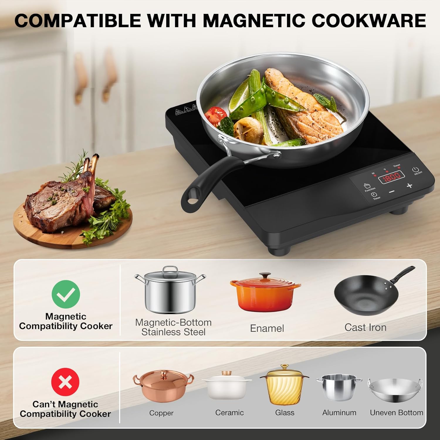 - Suitable with Magnetic Cookware: This 1800W electric cooktop is compatible with cast iron, enameled iron and stainless steel with magnetic base. You could make a "Magnetic testing". If the magnet sticks to the bottom of a cookware, it is induction compatible. The surface of the induction cooker is high-quality glass, which can be easily cleaned with a damp cloth