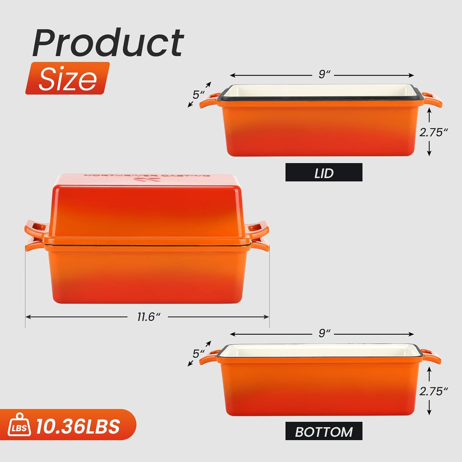- 【MORE WAYS TO USE】Enameled 2 in 1 cast iron bread pan set includes 2 separate 9"×5" standard loaf pan, can be used separately as bread loaf pans for sourdough homemade bread, or use as each other's lids when you need a perfect crisp crust, just like a dutch oven pot with lid.