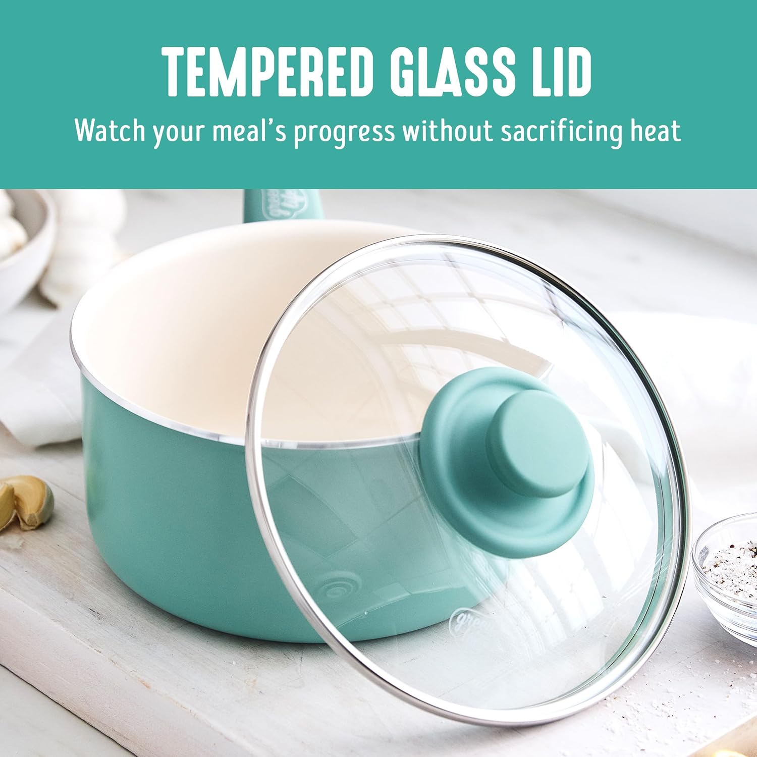 GreenLife 2 Quart Ceramic Nonstick Saucepan with Lid, PFAS-Free, Stay-Cool Handle, Multipurpose Kitchen Cooking Pot, Dishwasher & Oven Safe, Turquoise