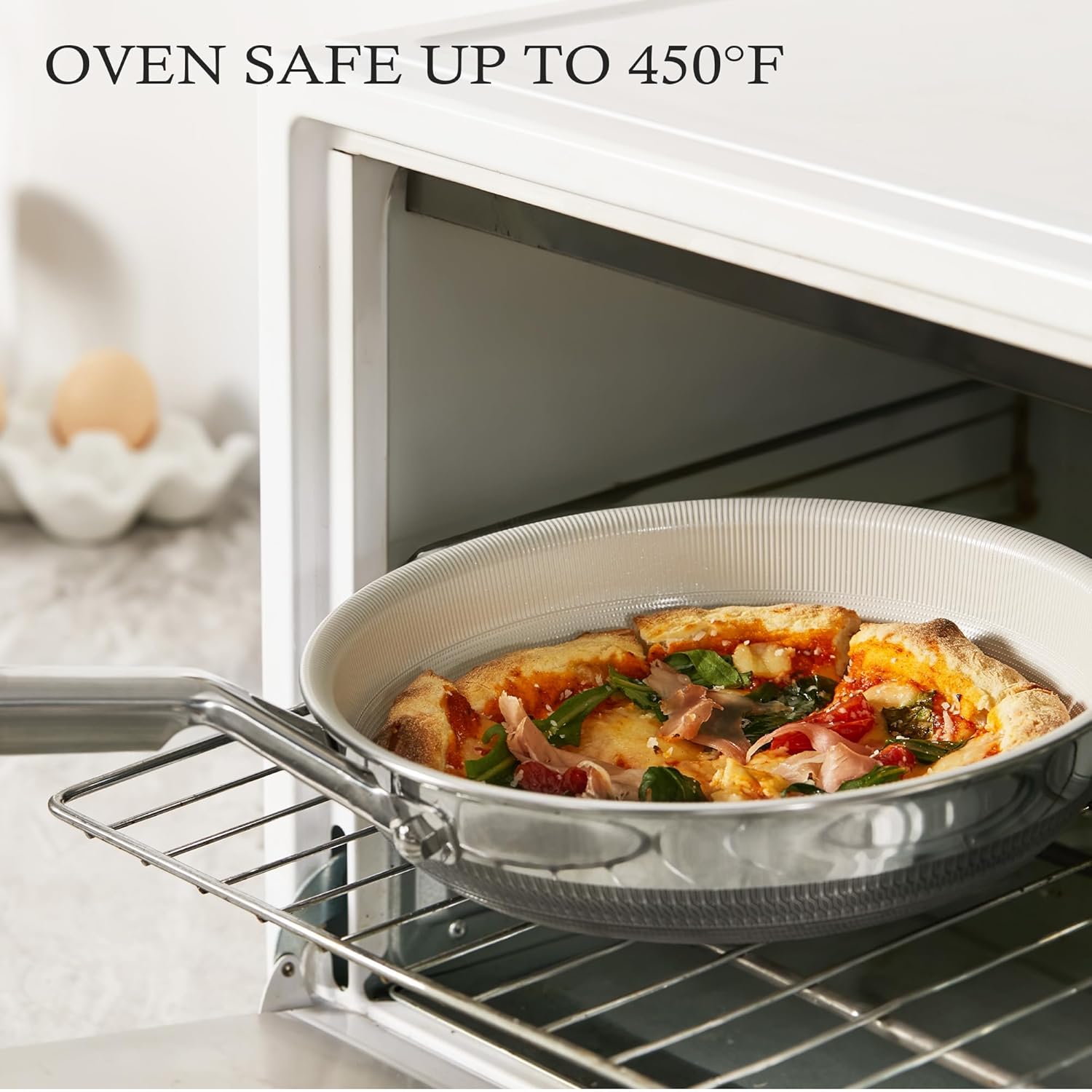 - 5-Layer Structure : Built with a titanium ceramic interior, a 4mm thick aluminum core, and dual stainless steel layers, this frying pan set offers rapid, even heat distribution and durability. The etched exterior resists yellowing and stains, while its five-layer construction locks in heat for perfect results.