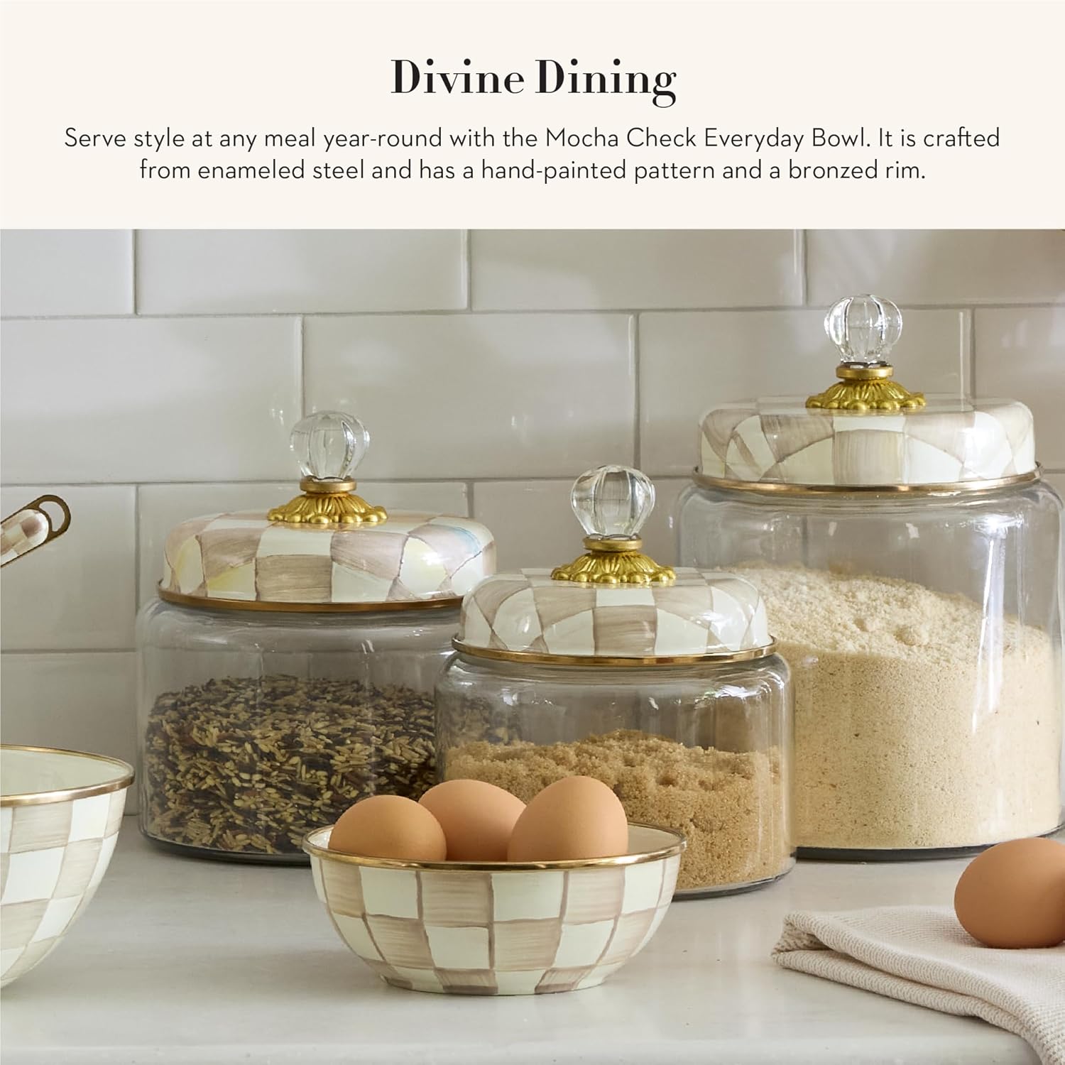 MACKENZIE-CHILDS Enamel Everyday Bowl, Serving Bowl for Entertaining, Extra Small, Brown-and-White Mocha Check