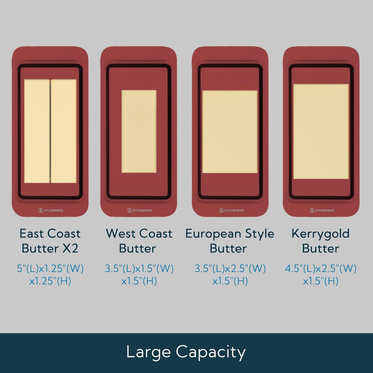- Large Capacity: The large butter dish with cover is suitable for Eastern, Western, European style and Kerrygold butter, cream cheese. The butter keeper can hold up to 2 sticks of eastern butter