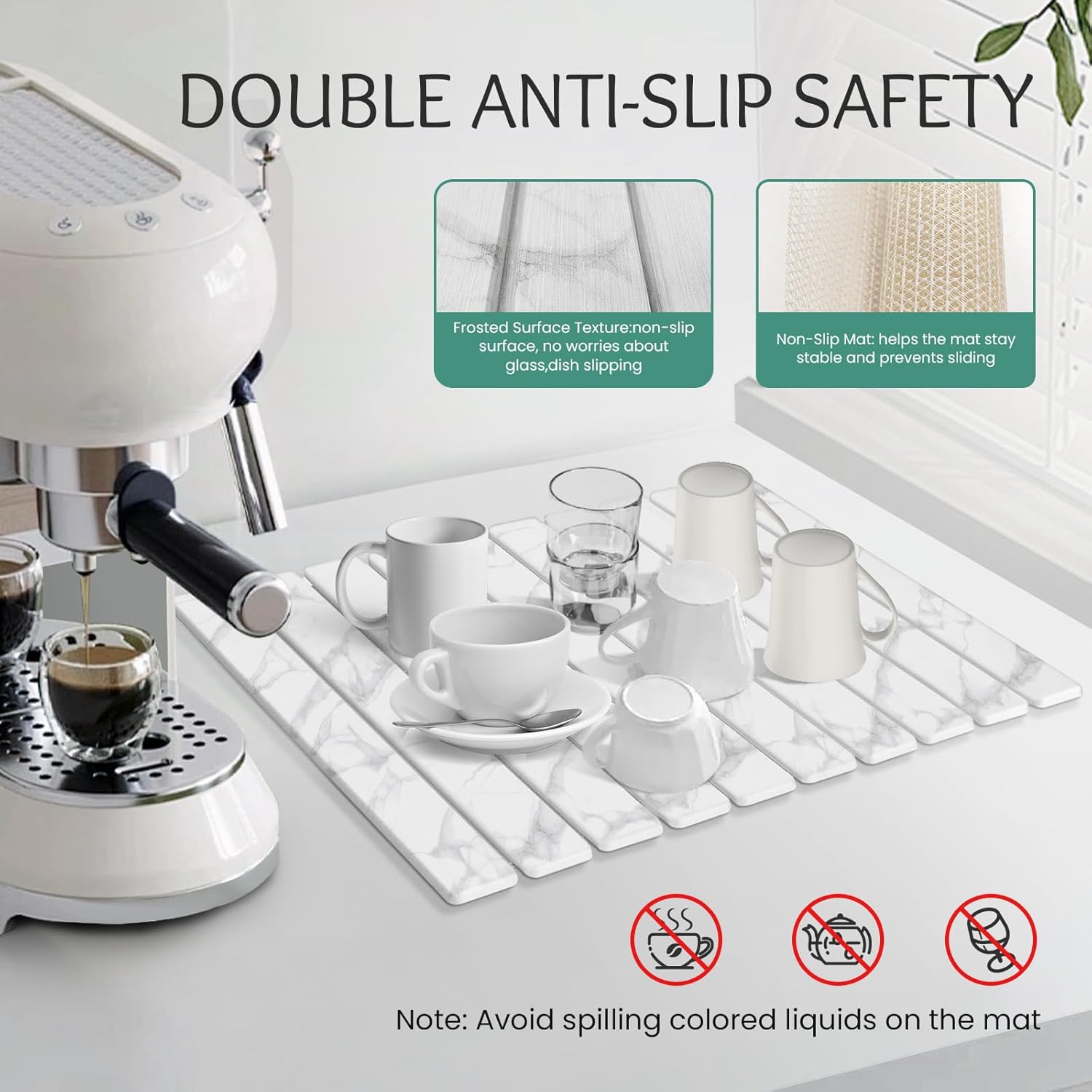 - 【Attention】:Avoid spilling dark liquids on the absorbent mat such as chili oil,soy sauce,red wine,etc.Due to stone drying mat its foldable design,there is a small spine between each panel,if the dishes or items carry a lot of water,which a lot of water will accumulate between the small spine,which is a normal phenomenon;our suggestion for this is to gently shake off the water from the washed utensils or items before placing them on the mat, or to gently wipe the accumulated water on the spine with a dry towel.