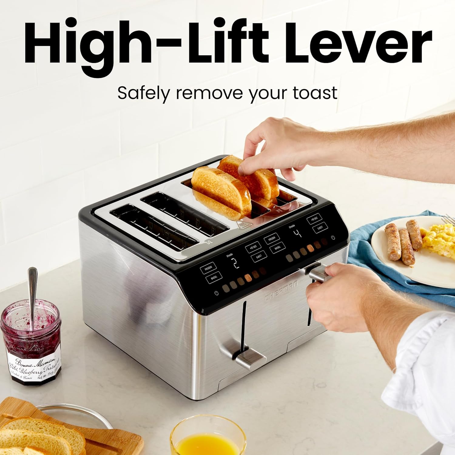 - SAFE AND CONVENIENT: To prevent burning, this toaster 4 slice has a high-lift lever which raises your bread upwards for easier removal. The anti-jam auto-shutoff turns off the unit if any food gets stuck in the slots.