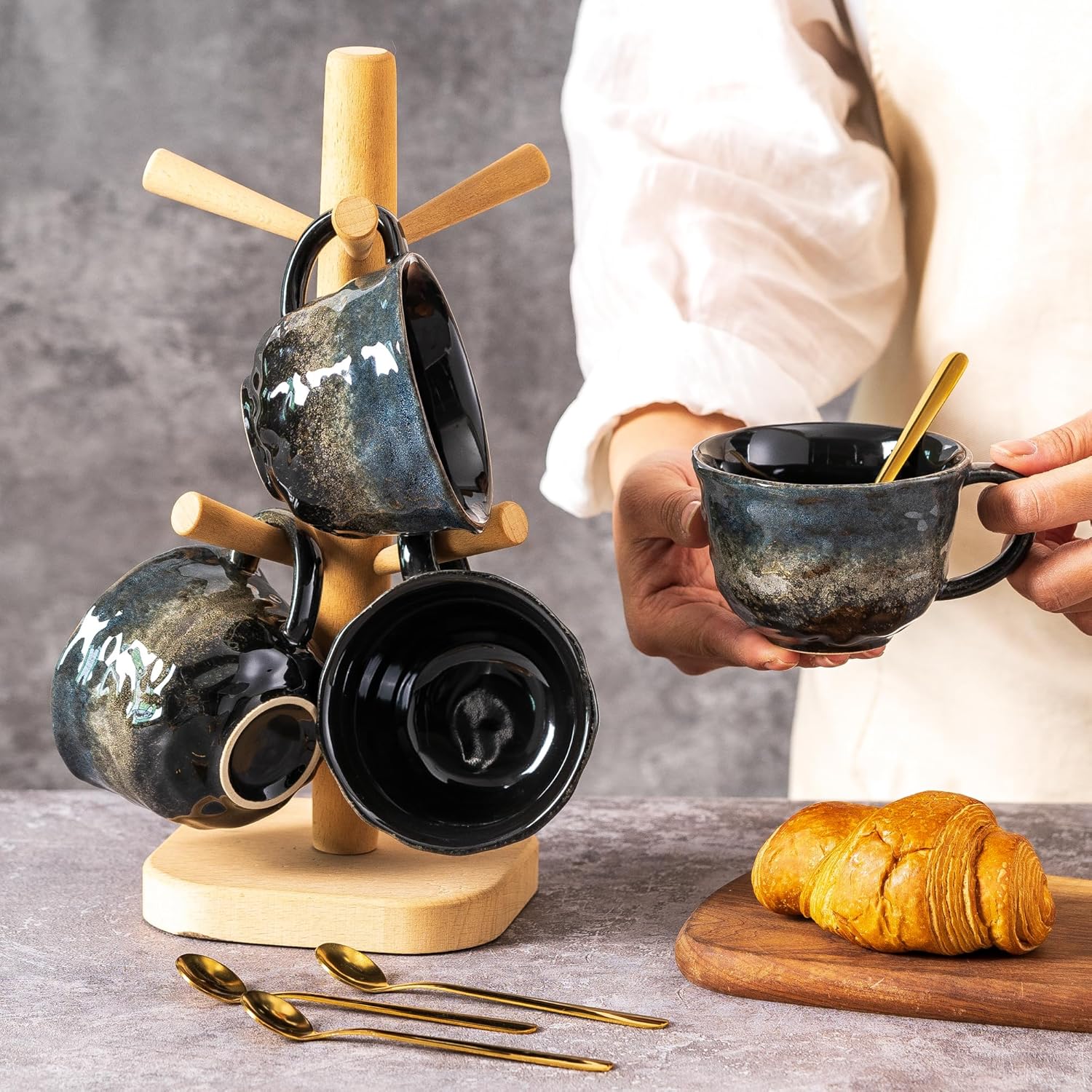 Coffee Mugs Cup, 8 OZ Ceramic Coffee Mugs with Gold Spoon for Man Woman, Modern Set of 4 Cup for Espresso Latte Cappuccino Cocoa Tea Dishwasher & Microwave Safe (Star Pulse)