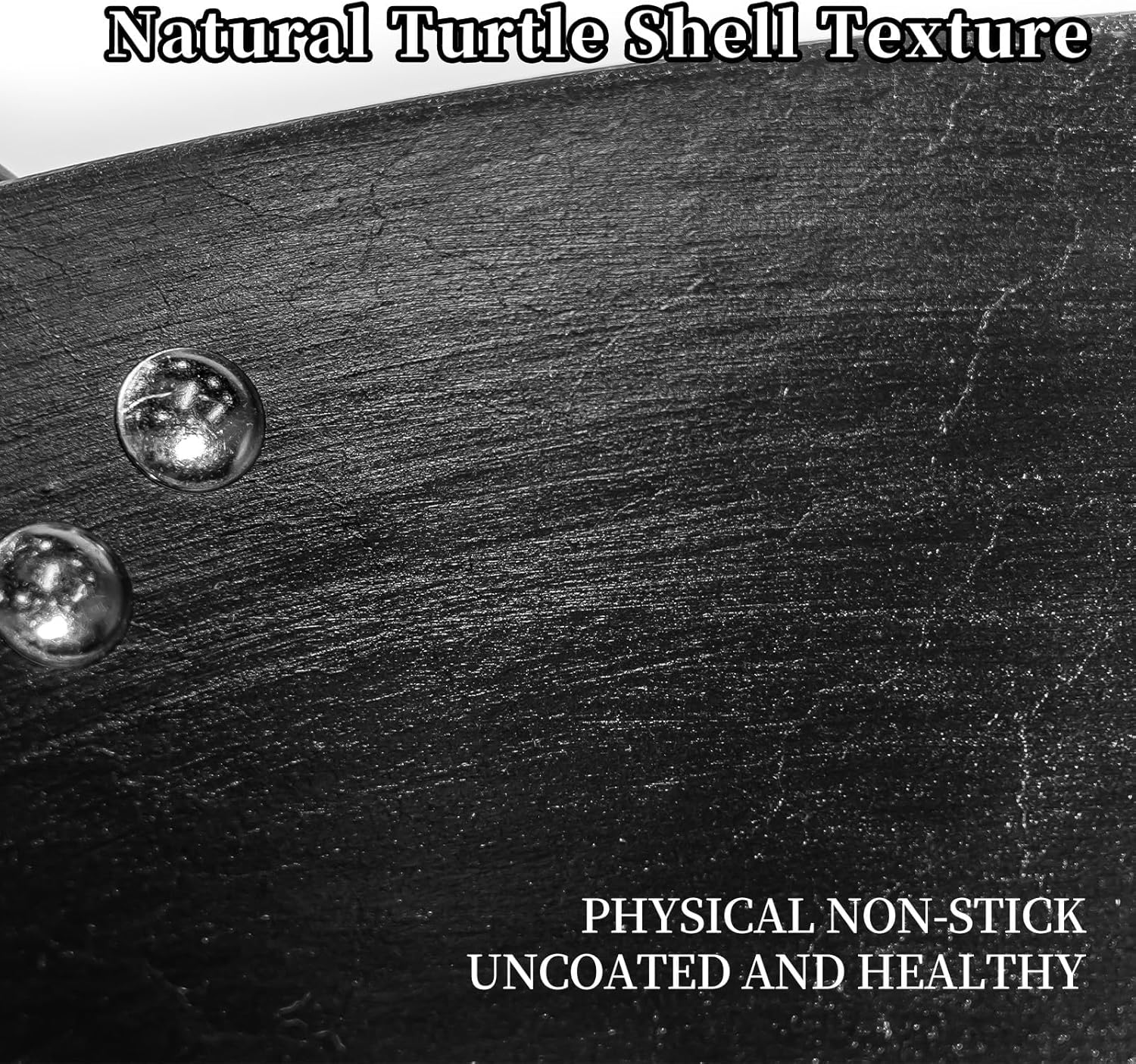 - PHYSICAL NON-STICK:Each handcrafted Cast Iron Wok has its unique texture forming from its clay casting mould and pinewood smoking ash. Echo to its beautiful name of "turtle shell texture",which can contribute to a physical non-stick effect