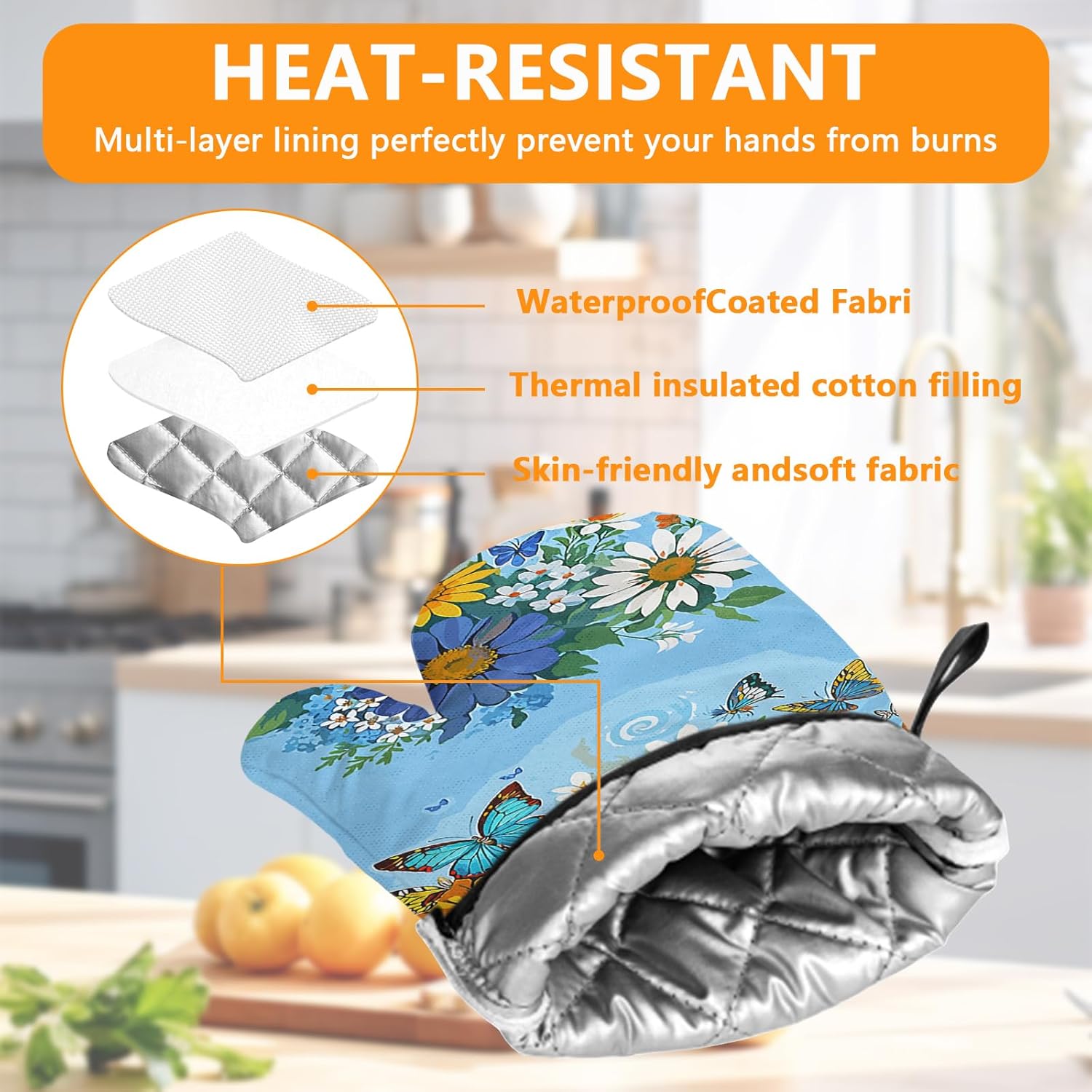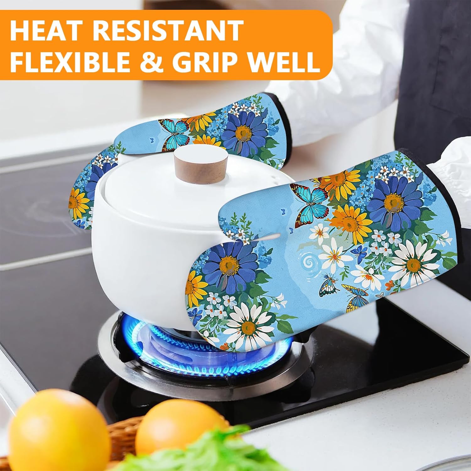 Sunflower Butterfly Oven Mitts and Pot Holders Sets 4Pcs,Extra Long Oven Gloves Potholder for Kitchen Cooking Baking BBQ 100% Cotton Heat Resistant