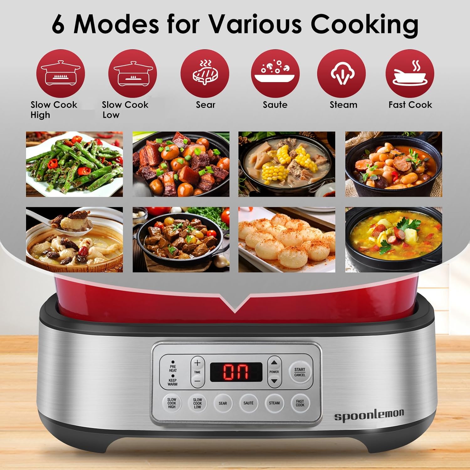 - Replaces up to 12 cooking tools and appliances: Equipped with 6 preset functions, including Slow Cook (Low & High), Sauté, Steam, Sear and Fast Cook, it effortlessly takes the place of your Dutch oven, slow cooker, steamer, food warmer, saucier, bread maker, nonstick pot, stock pot, sauté pan, roasting pan, saucepan, cast iron skillet, and various utensils. By consolidating these functions into one compact unit, the electric multicooker simplifies your cooking routine, making meal preparation easier and more efficient than ever.