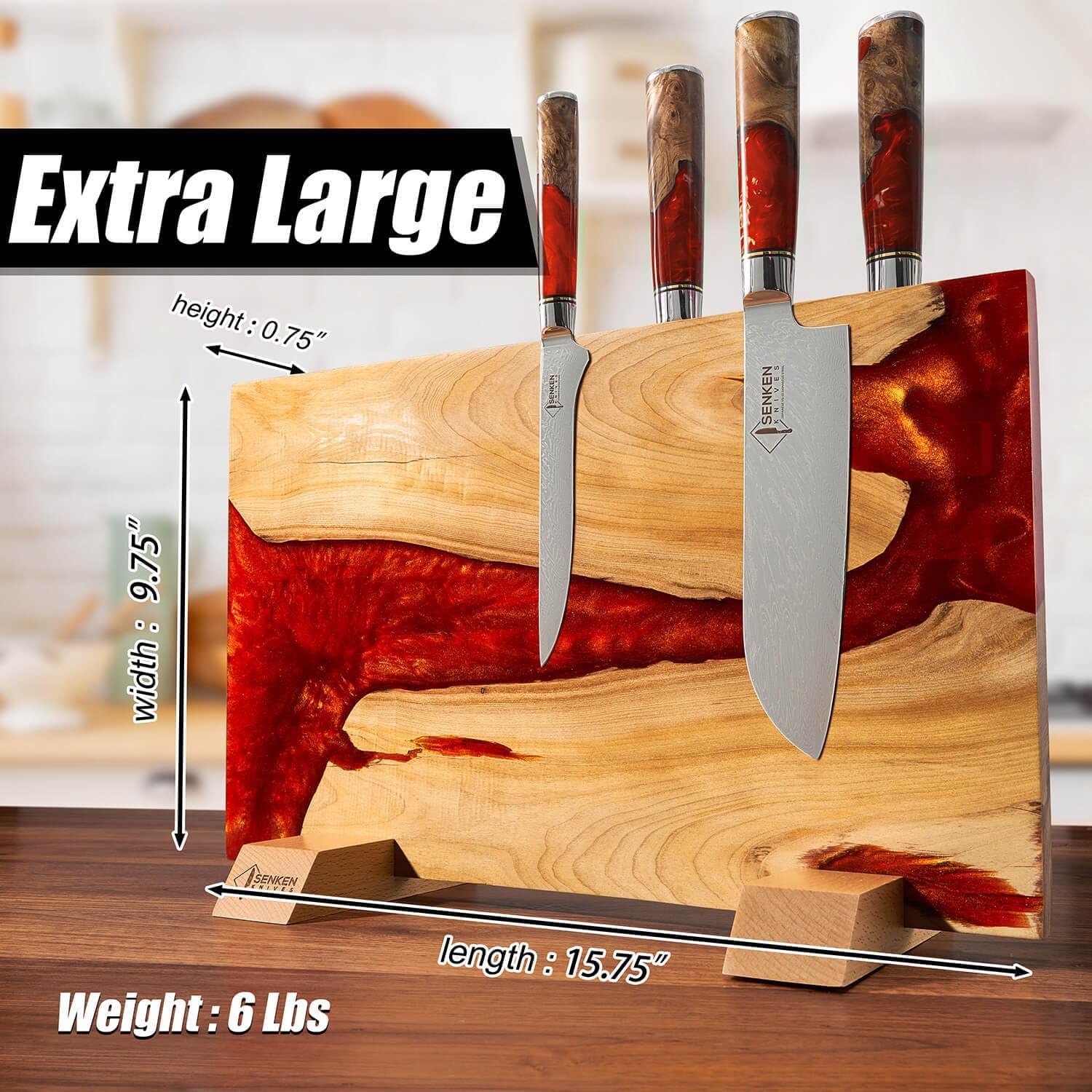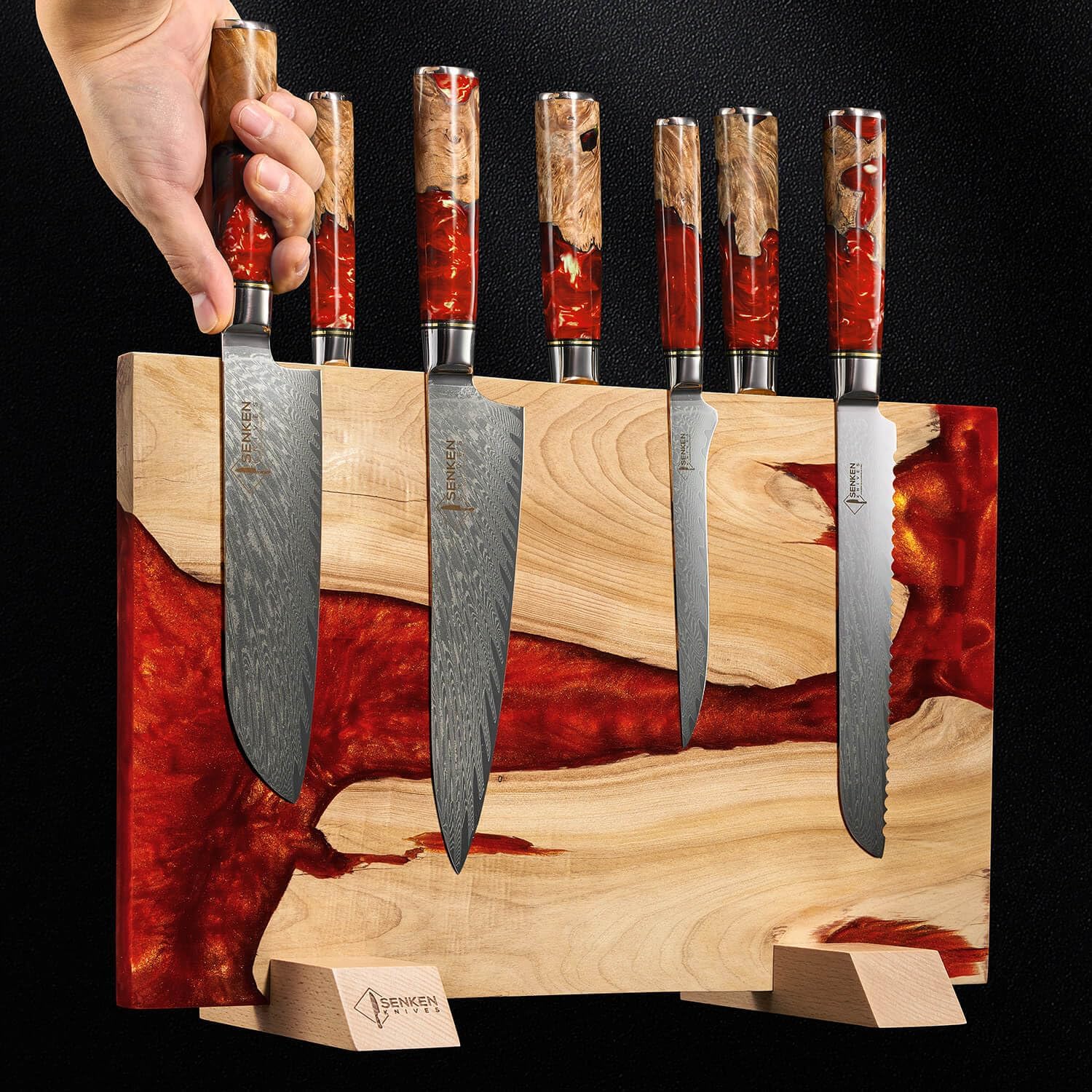 SENKEN "Red Tsunami" Extra Large Magnetic Knife Block - Holds Up to 16 Knives - Knife Block without Knives, Universal Knife Holder, Beautiful Red Resin & Natural Wood Blend ("Crimson" Red Resin Blend)