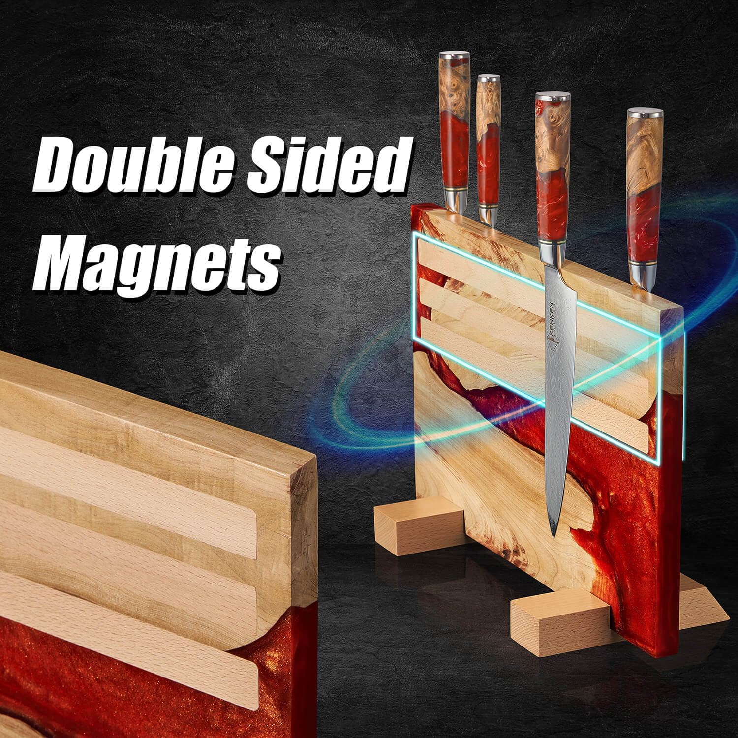 - 【 Ultra-Strong Neodymium Magnets 】 Powerful hidden magnets built into the wood block draw in the blade of your kitchen knives, allowing for quick and easy storage as well as aesthetic display.