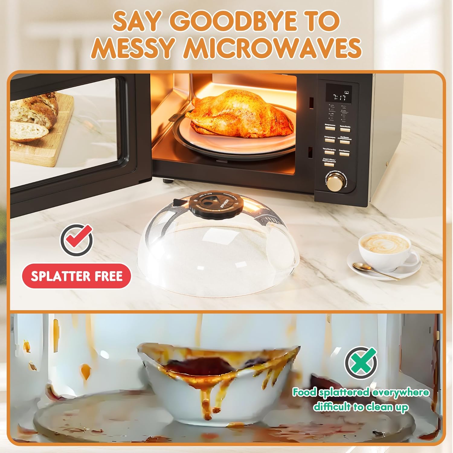 - 【Say Goodbye to Messy Microwaves】Our plastic microwave splatter cover with tray prevents food splatters, keeping your microwave spotless. Plus, it speeds up heating, saving you time and energy with every use.