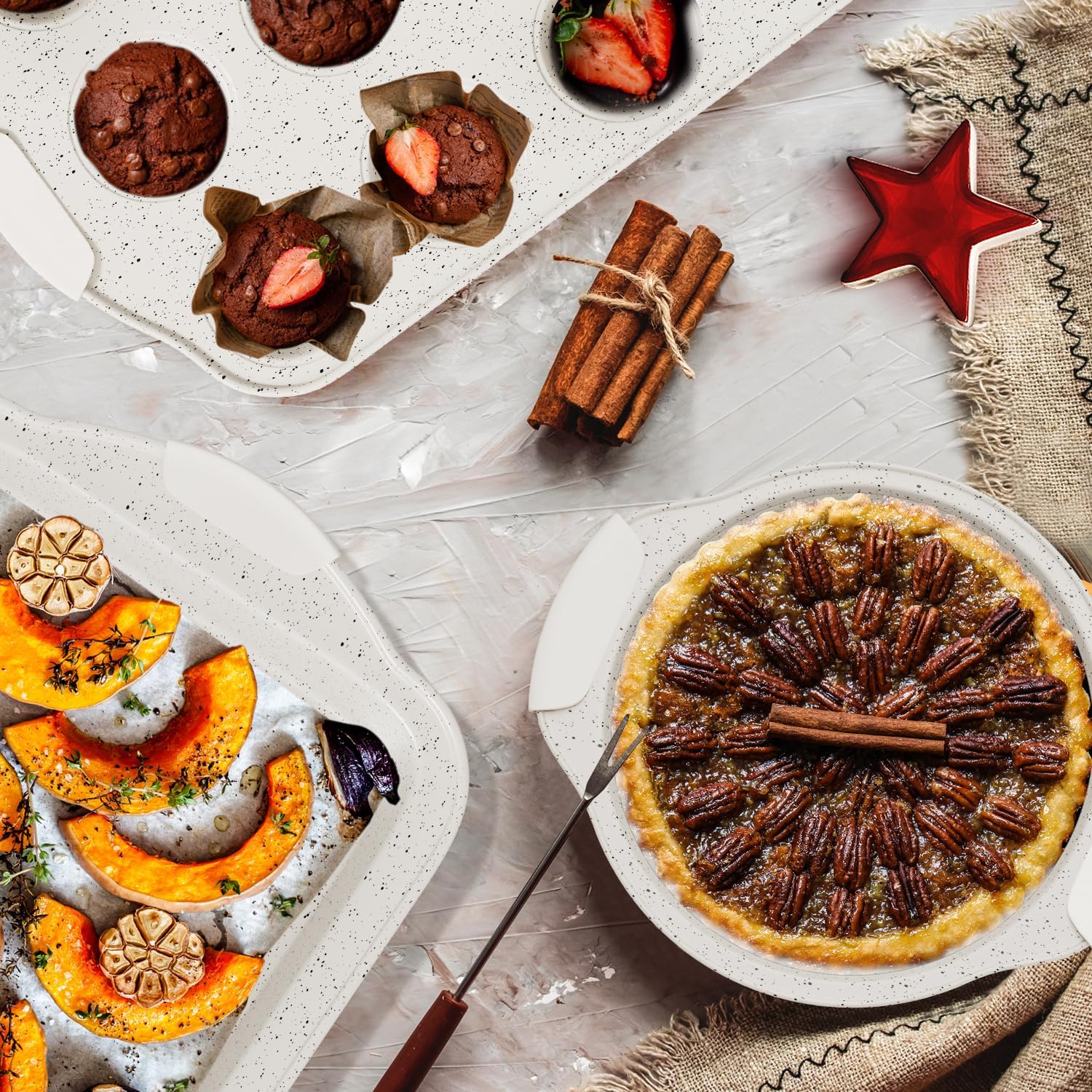 10-Piece Kitchen Nonstick Stackable Bakeware Set, Non Toxic Bakeware Sets with Silicone Handles, Includes Cookie Sheets, Cake Pan, Loaf Pan, Pizza Pan, Muffin Pan, White