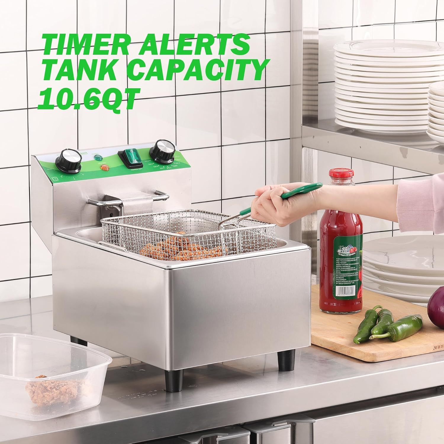 Electric Deep Fryer with Timer 10L/10.6QT Commercial Deep Fryer with Basket and Lid, Temp Control, 1700W/110V Stainless Steel Single Oil Fryer Countertop Fryer for Home and Restaurant Use