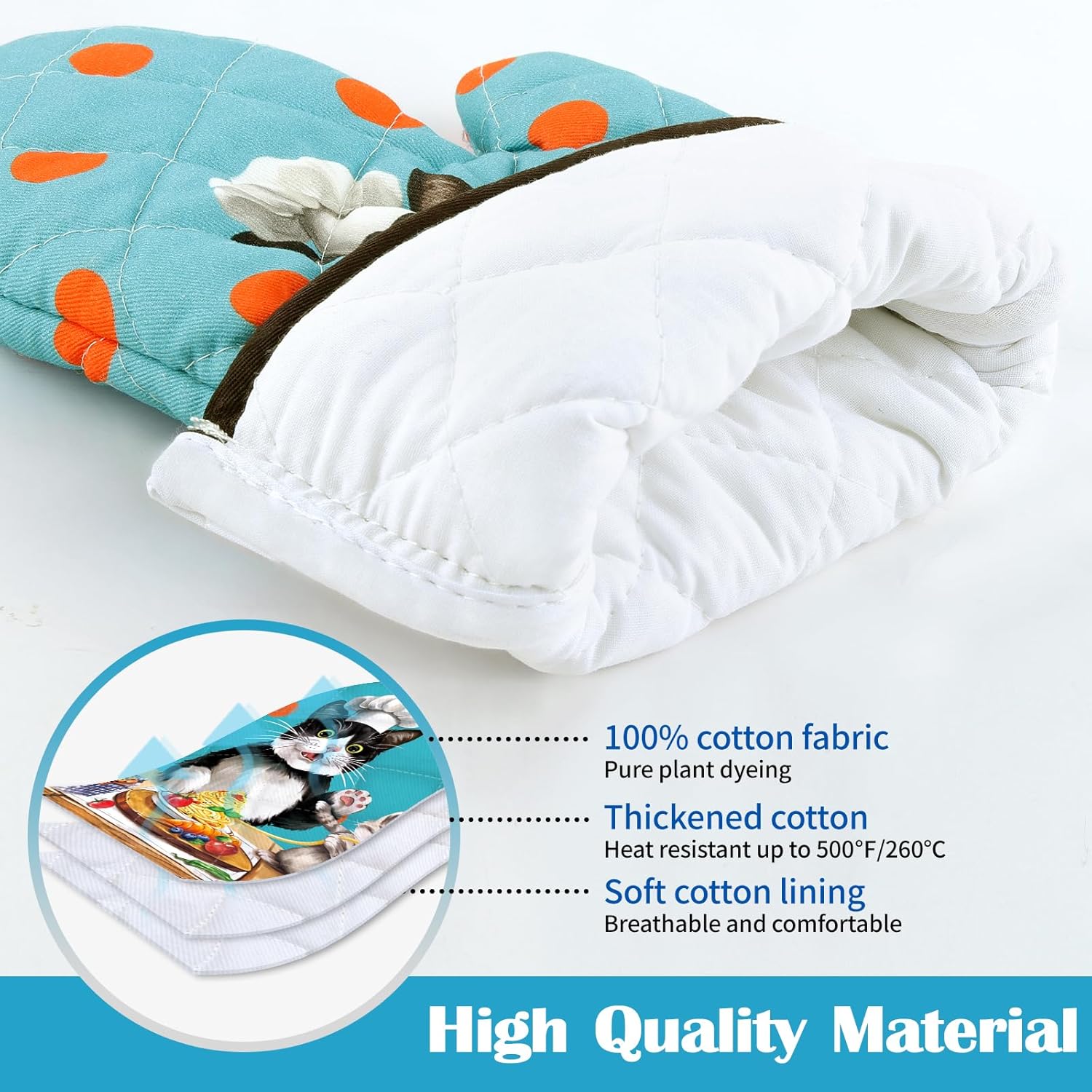- PREFERRED MATERIAL: Each pot holders & oven mitts set is carefully crafted from 100% cotton, with dyes sourced from plants, digital printing technology and upgraded color fixing process, the colors are bright and fade-resistant. Cotton lining to bring you comfortable and breathable touch and protect your skin as well.
