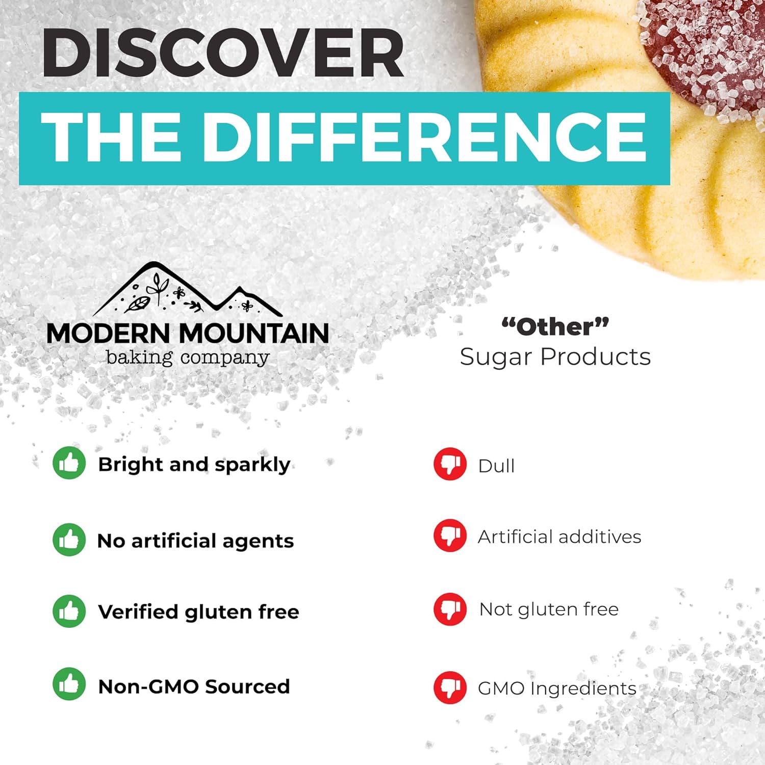 - PARTAKE IN PREMIUM, PROFESSIONAL QUALITY: At Modern Mountain, we pride ourselves on carrying the highest quality baking products around. No matter what you’re adding a little razzle dazzle to, you can rely on us to pack your pantry with products that we source non-GMO, test and verify gluten free claims, and never pad with artificial colorants or additives. The same is true of our white sanding sugar, of course, which are the brightest, most brilliant sparkle sugar crystals available.