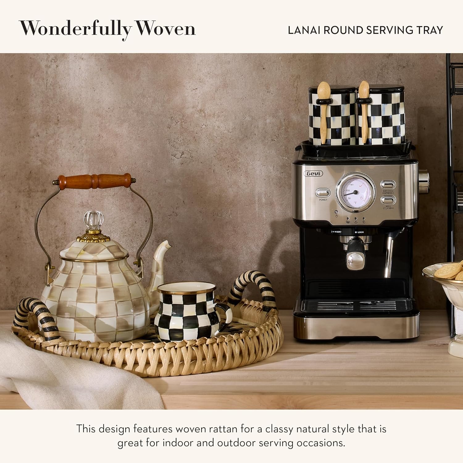 - ELEGANT SERVING ESSENTIAL: The Lanai round decorative tray features an intricate pattern of contrasting woven rattan in shades of black and brown. Use it to create a basket-decor centerpiece in the living room, bedroom, kitchen, bathroom, or patio.