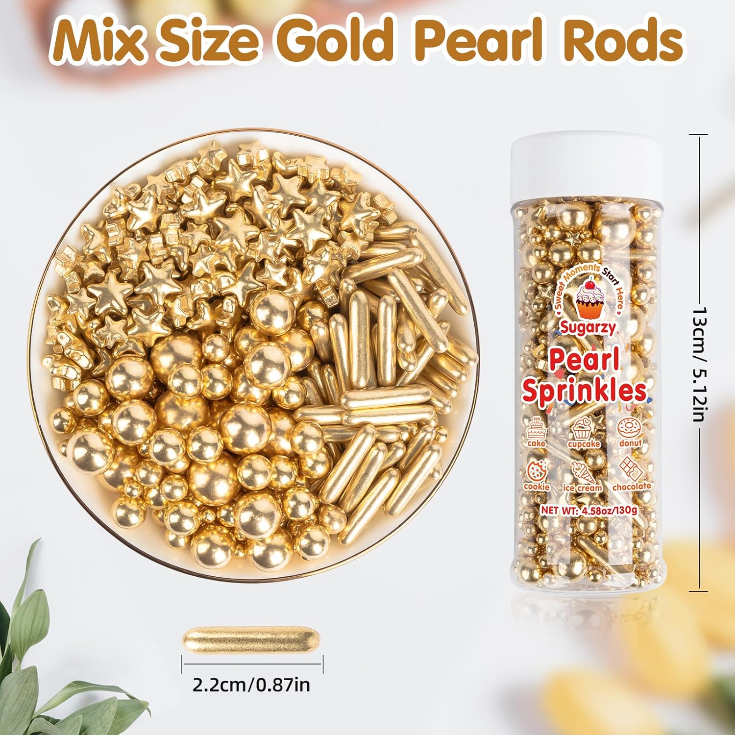 Gold Pearl Sprinkles,Edible Pearl Stars Rods Sugar Candy,Mix Size,Baking Cake Decorations,Cupcake Toppers,Cookie Donuts Ice Cream,Holiday,Birthday Wedding Party Valentines Christmas Supplies,130g/4.58oz