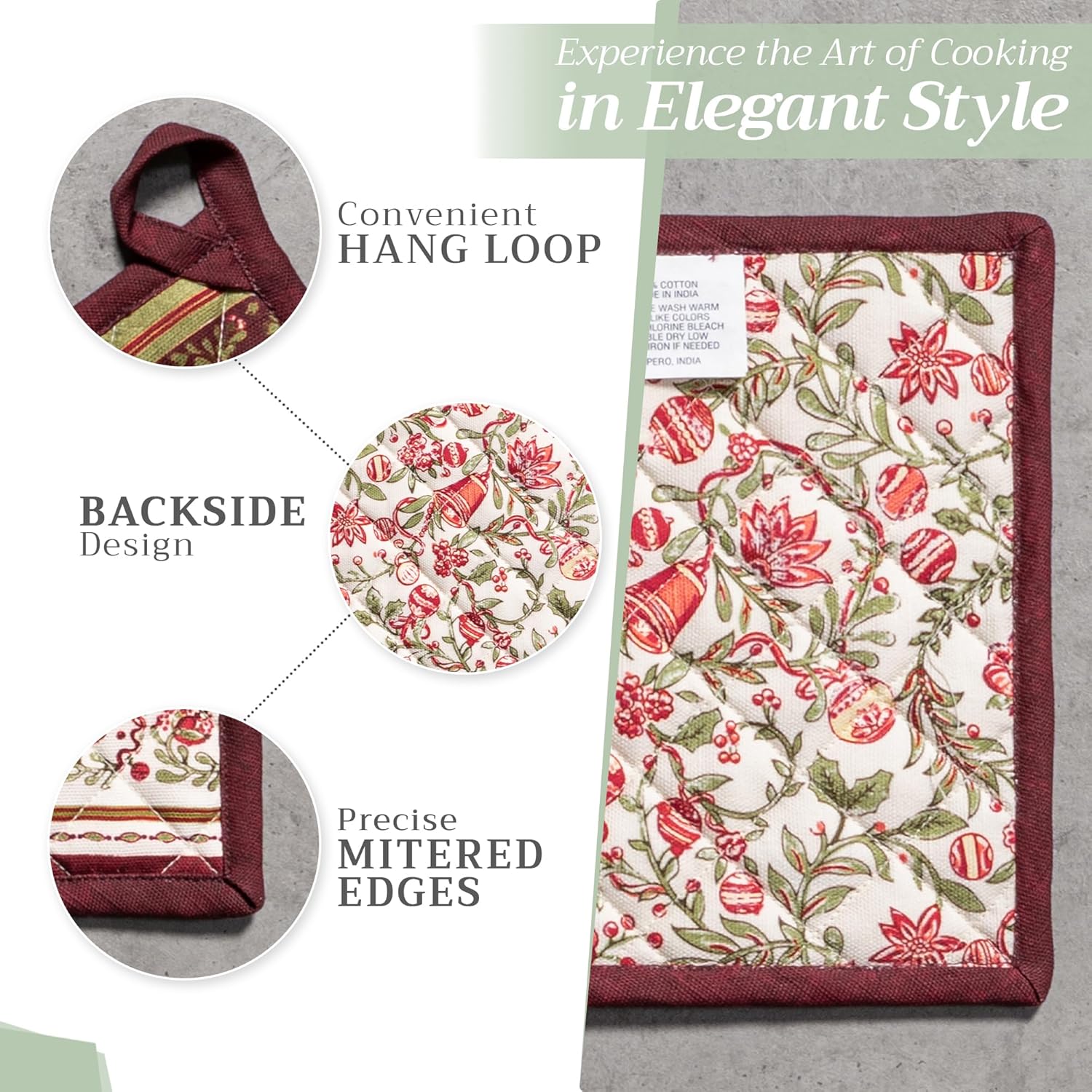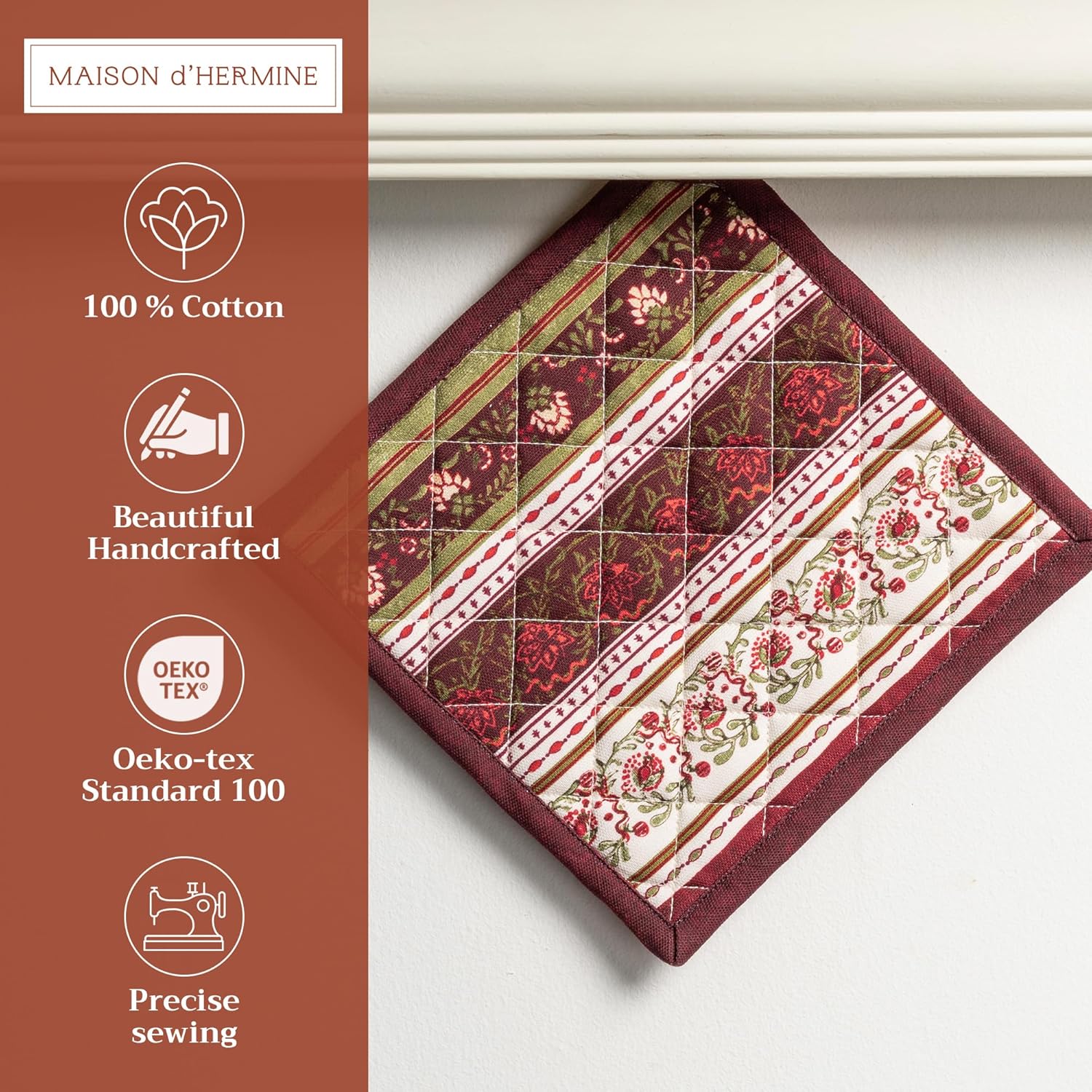 Maison d' Hermine Pot Holders Set 100% Cotton Heat Resistant Potholders 8" x 8" Hot Pads with Loop BBQ, Cooking, Baking, Grilling, Kitchen, Handling Hot Pans (Pack of 2, Reveillon Au Jardin)