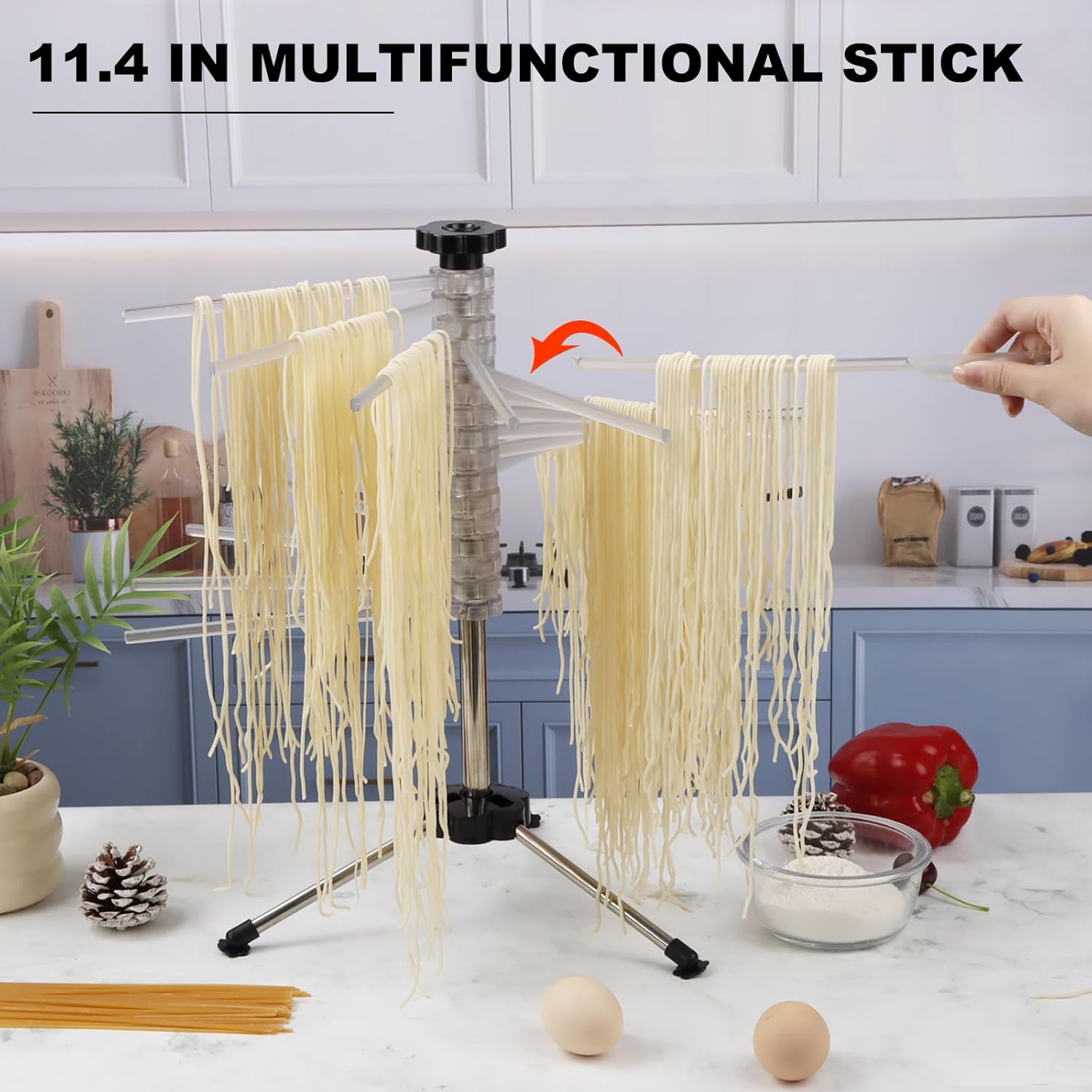 - ANTI-SLIP DESIGN- Equipped with rubber feet for stability, ensuring safe placement on any kitchen countertop without slipping. Extend the 3-legged base of the drying rack so it stands firmly upright, then rotate the black knob on top to extend the rods, to safely transport dried pasta from rack. The multipurpose transfer stick easily picks up freshly cut pasta for safe transport to a drying rack or cooking pot, and stores neatly in the center column when not in use.