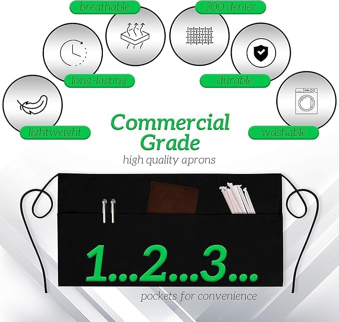 - Commercial Grade: black aprons for servers are perfect for servers in Restaurants, Bars, Cafes, or at Home in the kitchen, garden, or craft table. These comfortable, durable, light weight waist aprons comes with 3 pockets and you can wear them for all your serving needs.