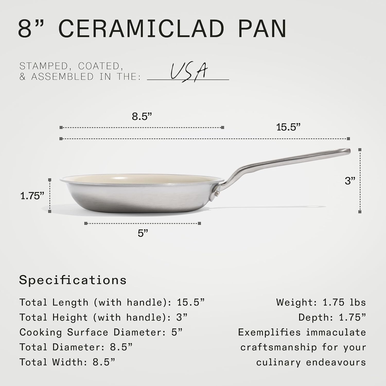 - Total Diameter: 8.5” | Cooking Surface Diameter: 5” | Height (with handle): 3” | Depth: 1.75” | Length (with handle): 15.5”