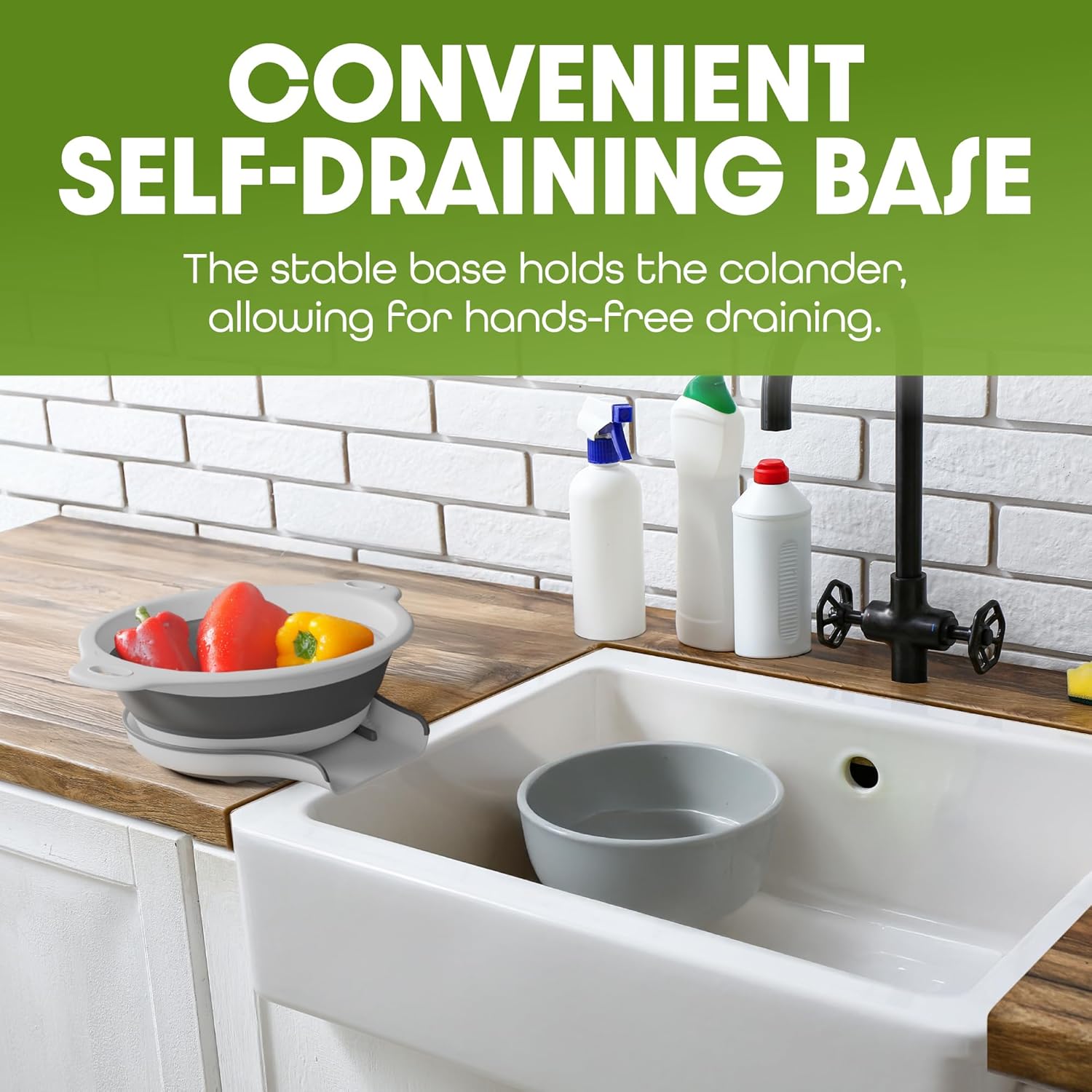 - This collapsible colander features an innovative self-draining base that allows water to drain directly into your sink, even when it's full.