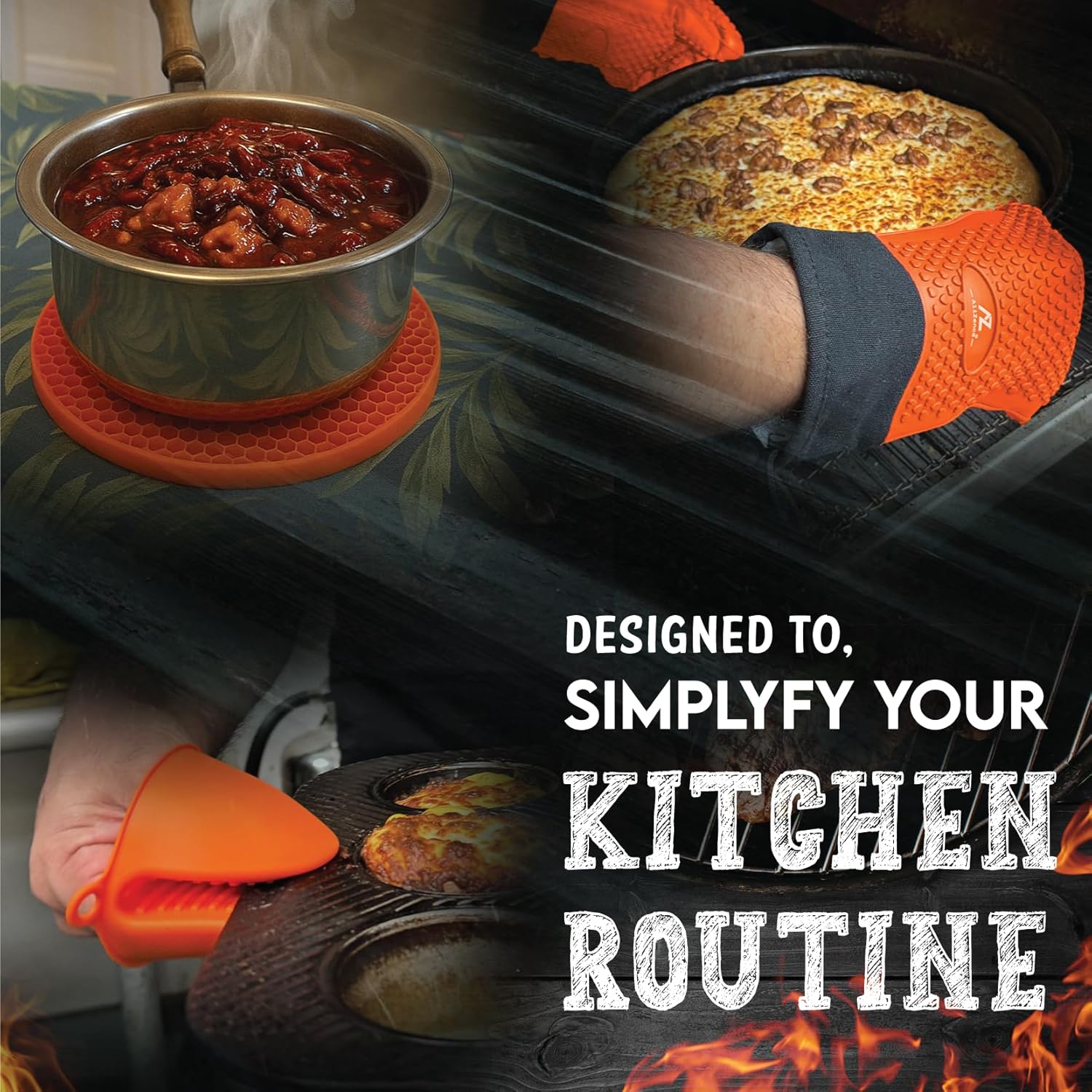 - Complete 6-Piece Kitchen Set: The AliZence Kitchen Essentials Set Includes two long silicone gloves (13 inches), two silicone pinch gloves, and two round hot trivet mats, designed for handling hot cookware safely.