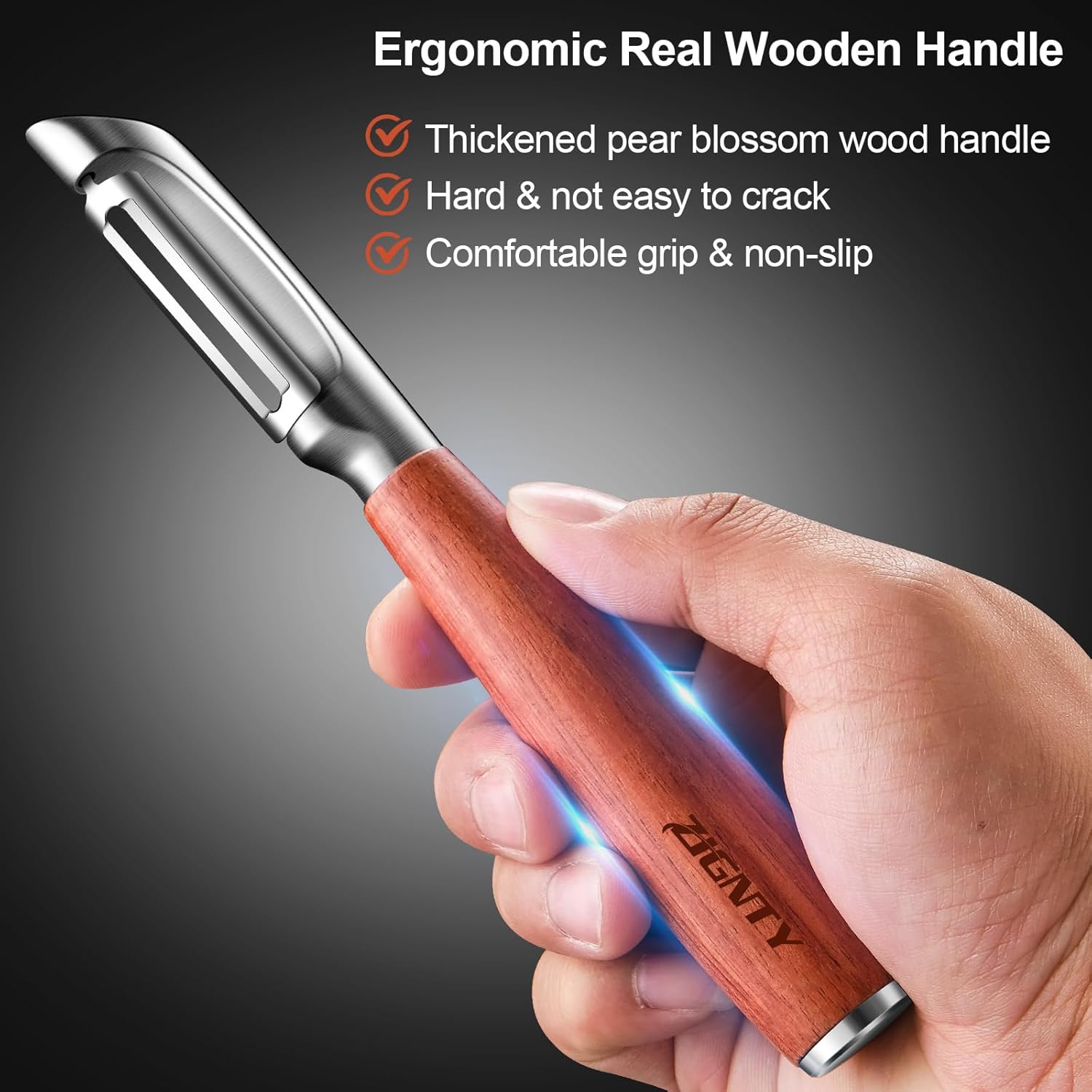 - 【Ergonomic Real Wooden Handle】The handle of the potato peeler is made of natural wood, hard, not easy to crack, feel round and comfortable. Ergonomic design, fit the palm, grip comfortable, non-slip. The stainless steel vegetable peeler is suitable for both left and right-handed cooks, and is friendly to those with arthritis. The thickened wood handle allows you to feel as if you are immersed in nature, bringing a relaxing and warm cooking experience.