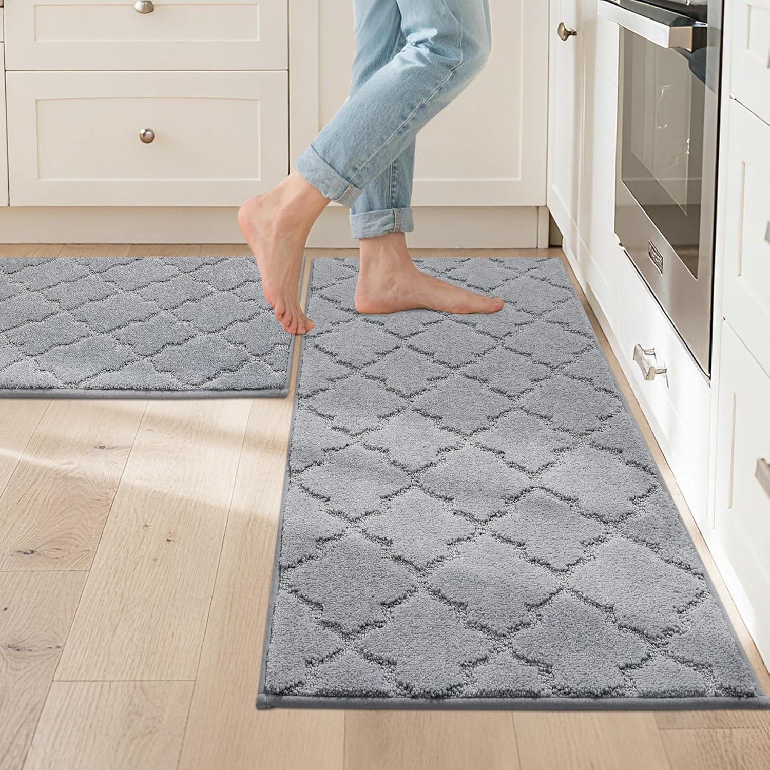 JSEI Kitchen Rugs, Non-Slip Kitchen Mats for Floor, Soft Washable Absorbent Kitchen Mats 2 Pieces, Kitchen Carpet Runner with TPR Backing, Polyester, 20”x32”+20”x48”, Light Grey