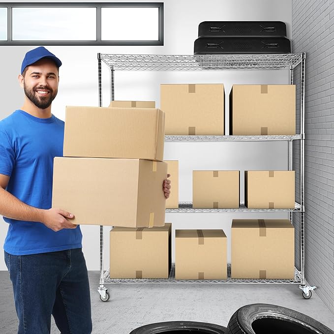 4-Tier Metal Wire Shelving Unit with Wheels, 60" x 24" x 72" Heavy-Duty Storage Rack for Garage, Kitchen, Pantry, or Restaurant, 2400 lbs Capacity, Chrome Finish