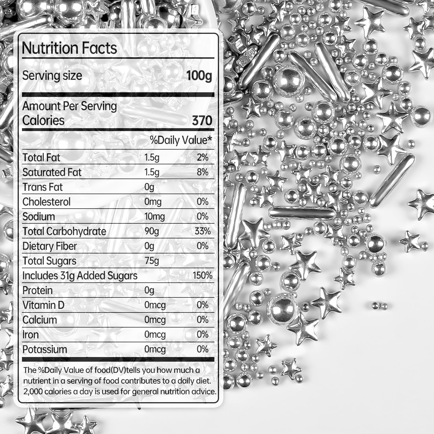 - Silver Pearl Rods Star Sprinkles are made up of pearl rods with mixed sizes and charming star shapes.With a net weight of 150g/5.29oz, they are free from gluten, nuts, preservatives, dairy products, artificial chemicals, and genetically modified organisms.