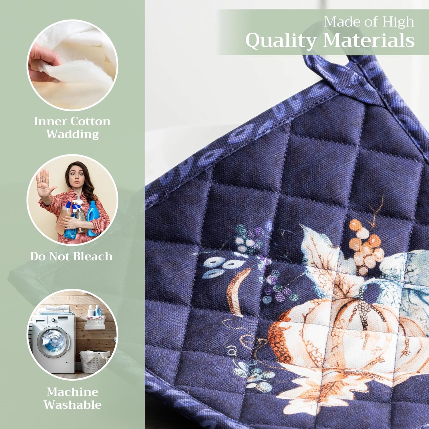 Maison d' Hermine Pot Holders Set 100% Cotton Heat Resistant Potholders 8" x 8" Hot Pads with Loop BBQ, Cooking, Baking, Grilling, Kitchen, Handling Hot Pans (Pack of 2, Pumpkin Blues)