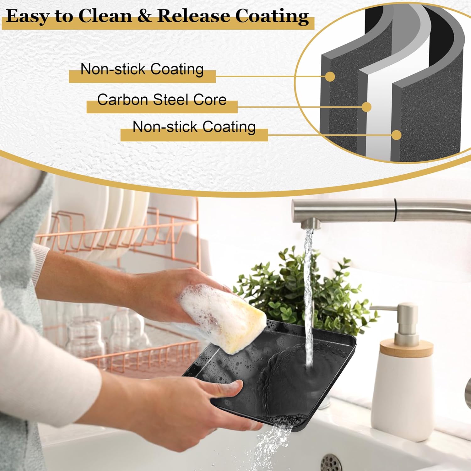 - MAKE CLEANING A BREEZE: One-piece design metal baking tray with smooth surface and no rough spot, Round corner with no dead end make baked food come out perfectly and completely, Non-stick coating can easily release food and no more concerns in food sticking problem, Can easily rub the dirty away, Dishwasher safe for effortless, Recommend to wash by hand for longer service life
