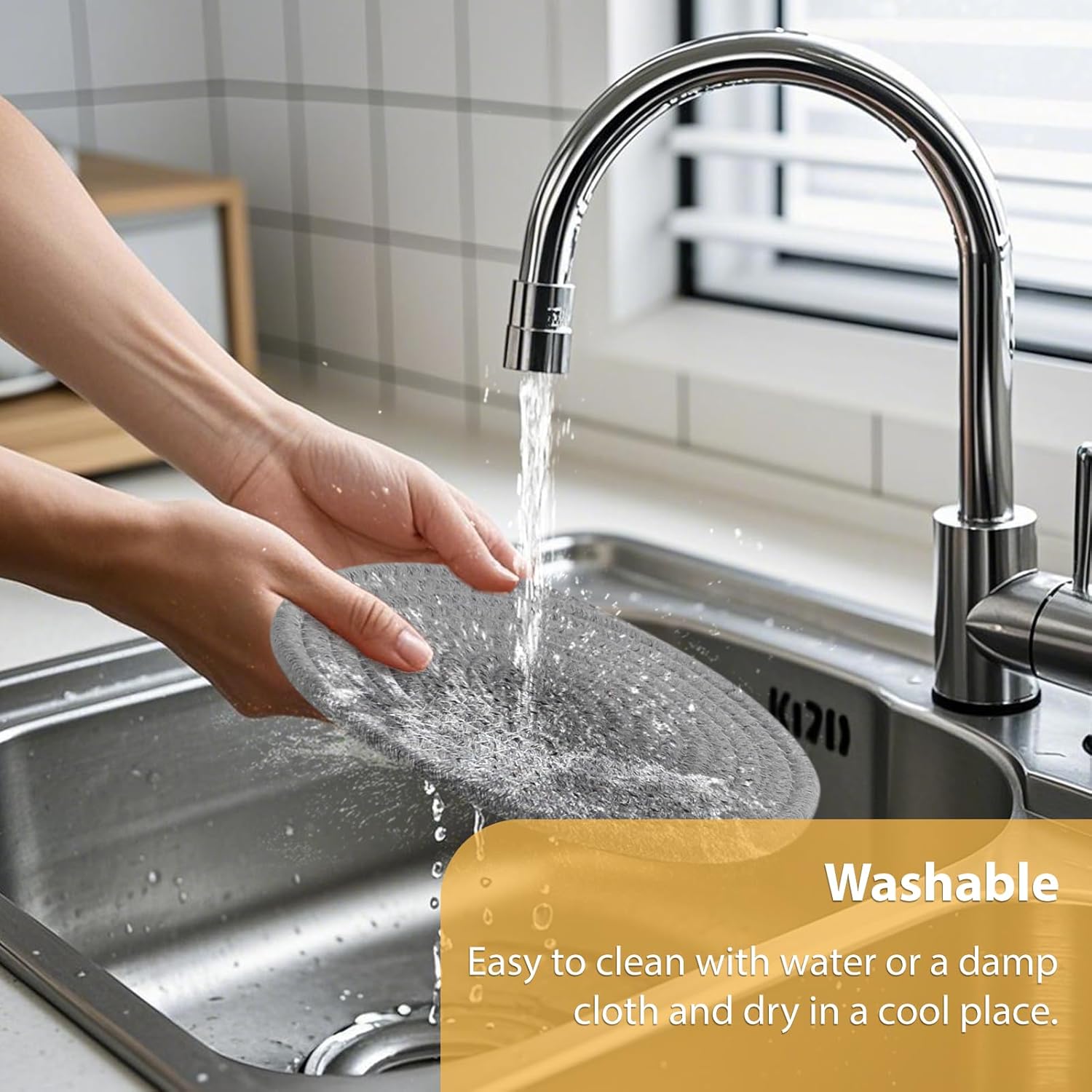 - Super Absorbent & Easy to Clean: These thick woven cotton trivets have better heat absorption, liquid absorption and better protection of the wood surface from water rings, stains and potential damage. Support both machine wash and hand wash, keeping your pad set fresh and ready for reuse